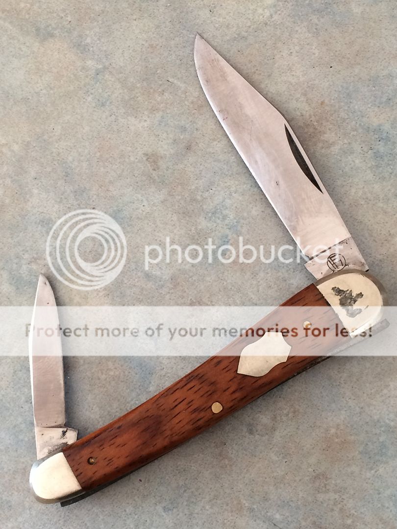 I really liked the half whittler, it immediately caught my attention as very similar to my Boker Whittler, and much similar to the Forum knife- excepting for a secondary clip blade (yay!! No pen blade), instead of the sheepsfoot on this years knife. Well made, one pin has been set too deep into the wood do the wood has let go a bit, but two knives for $10 I can't really complain and I'm going to use it anyways, so I'm not too critical. It's a little bigger than my Boker and finished a bit differently (domed pins on Boker, radiused grind around frame on this one, but both look like the same type of wood and are even the same with light wood on one side and dark on another), so I'm not sure if Boker had a hand in it or not, but this is the only symbol it has, with "Rostfrei Solingen" on the obverse. ??"HF"?? It's a very well made single spring.