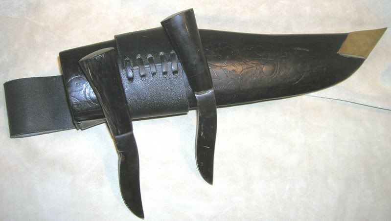 The sheath is also water buffalo with the 100yr. old frog(that what they call it). The Chacma(spelling?) and Karda are both handled with buffalo horn and also made from the Mercedes leaf spring.
