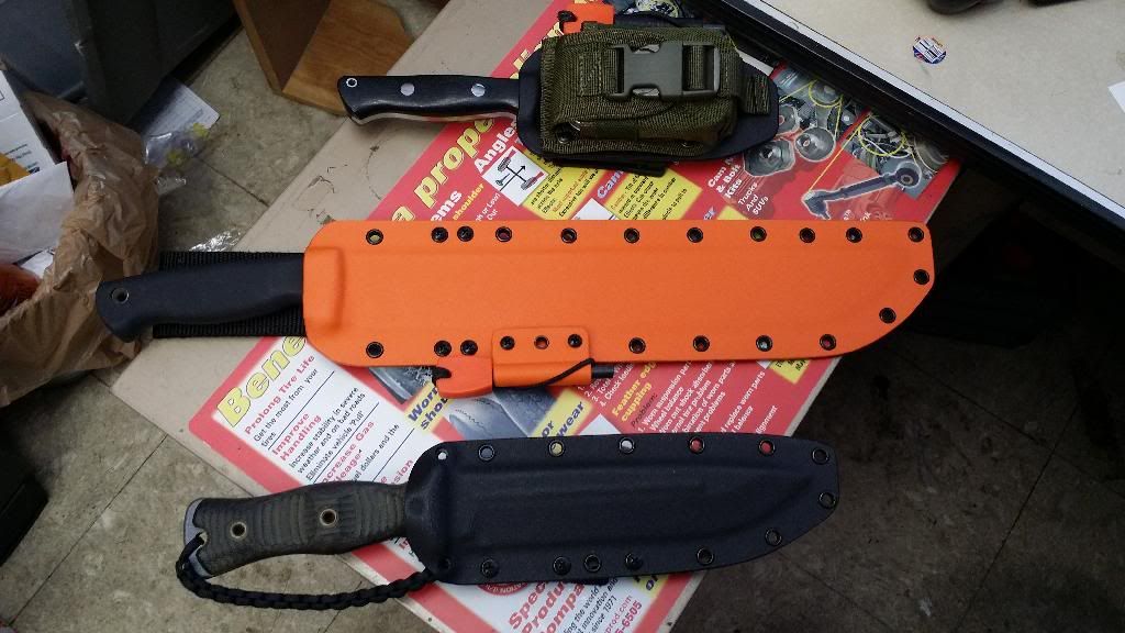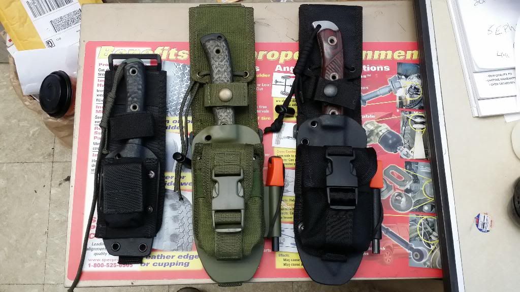 I had David Brown make me some cool sheaths...The first 3 have ESEE Molle back with some pouches attached to them and also the Bravo 1....These were made to fit the molle backs and pouches .....The others are just cool....