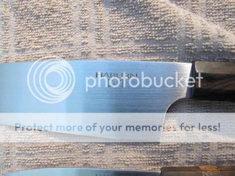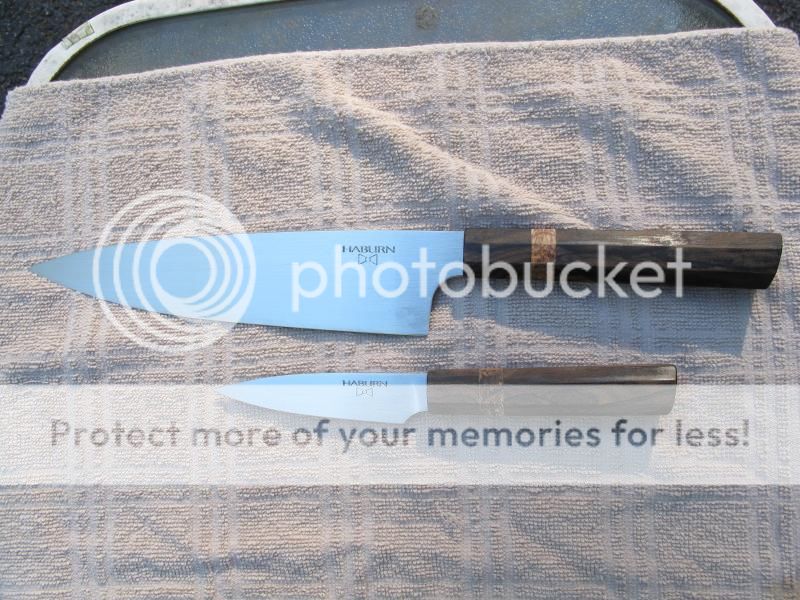 Selling a matching pair of Haeburn Gyuto and Paring knives. they are AEB-L steel. Here is the original sale thread for the Gyuto with specs. http://www.bladeforums.com/forums/showthread.php/1208744-Chef-AEB-L I ordered the matching paring knife from the maker. It has the exact same steel and handle but is 8 1/4" OAL and has a 4" blade. These are beautiful, very light and tremendous slicers. They have been barely used. The Gyuto has a small faint smudge of patina that I tried to show in the close up pic and can probably be buffed out. the paring knife looks brand new. These knives are amazing. I'm only selling for financial reasons. Asking $235 net to me for the Gyuto and $79 net to me for the paring. Will sell both together for $300 net to me shipped and insured.