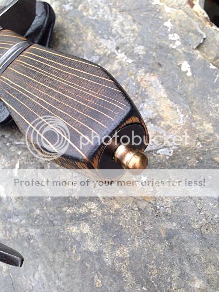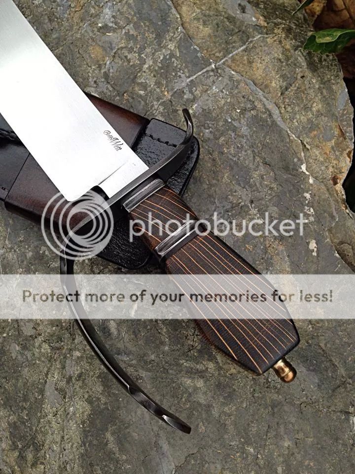 The handle is 300 + yr old American Chestnut, recovered from an old farm house built over 200 yrs ago. The wood grain is spectacular and the bronze colored rays are unlike anything growing today. The "S" Gard was forged from swamp recovered Wagon Wheel Wrought Iron. It has been Bleach Boiled with Mustard and Cold Blue. Two of the handle Spacers and the Butt Cap are also from the same Wrought Iron. The other two handle spacers are Ebony. The Finale is Silicon Bronze shaped on my drill press ... I haven't got a lathe just yet. O.A.L is right at 21"