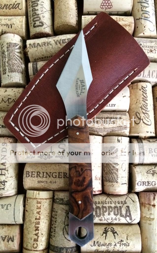 For sale is my custom Kiridashi from Ian Hall at Hall Handmade. CTS-XHP steel; Desert Ironwood Burl handles. This arrowhead style dashi has absolutely gorgeous grinds, and the cutting edge is screaming sharp. It is unused short of testing the edge on paper. It has been carried a total of one time, in my EDC bag, so it's never even been pocketed. It comes in the hand-stitched leather pocket sheath as shown.