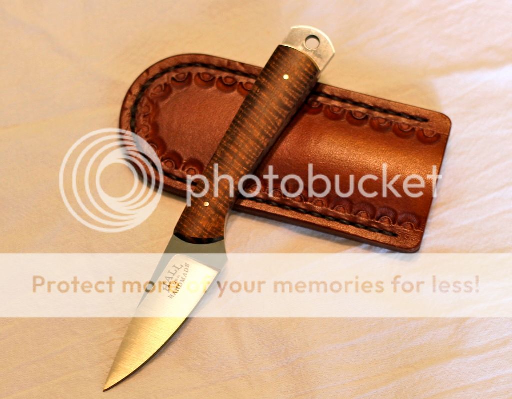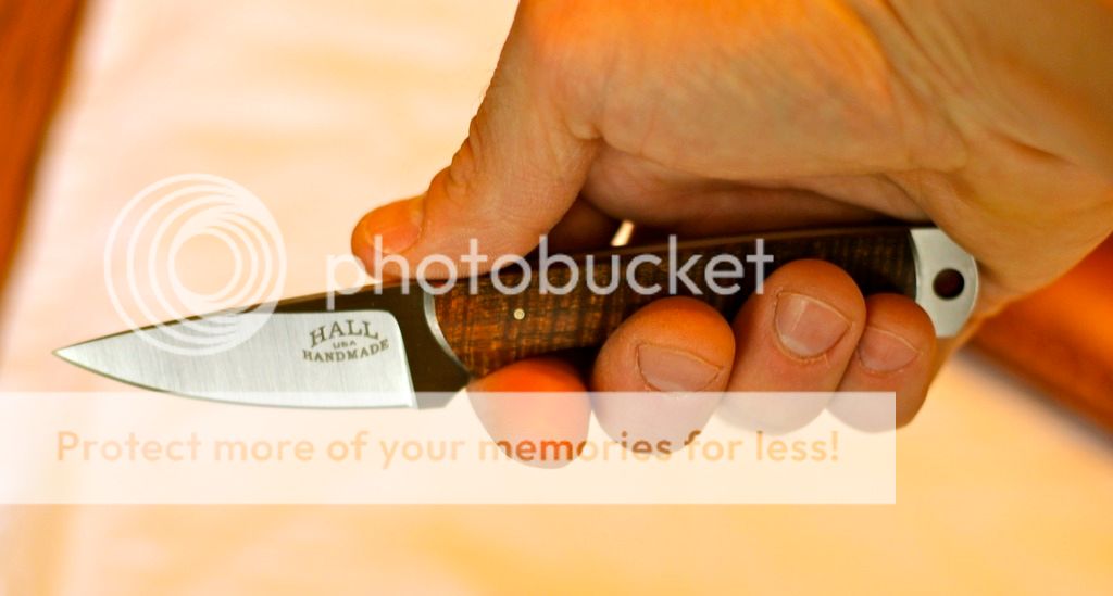 Listing my beautiful Hall Handmade covered with beautiful, tight grained koa. I've carried this knife maybe 3 times since I've had it and opened the mail once. The rest of the time it has sat unused in my knife drawer. OAL is 6.5 inches and cutting length is 2.5 inches. CTS-XHP steel. Beautiful knife shipped with a pocket sheath which was also made by Ian Hall. No marks, scratches or blemishes that I can find. Pretty much looks brand new. Shipped to you for $SOLD. Paypal preferred. Thanks.