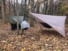 Here is a (terrible) picture from a 2009 hike I did with my father and brother - we were in the backwoods, but found a nice spot that we could hang in triangle and rig our tarps to have a dry common area in between them all. the dark gray tarp on the right is the ENO dryfly. the light gray is the sportsmans guide. I don't recall the make of the green one right off.