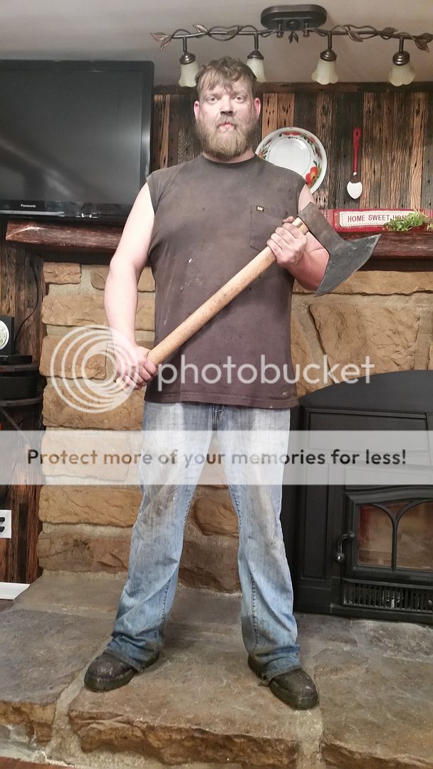 A very good friend asked if I would make him an axe similar to Rolls from the show Vikings. Double horned, etc. This is what I came up with. The body is mild steel, wrapped and welded eye, with a 5160 bit forge welded in. It is 9.5" tip to tip. Handle is 29" and it handles like a dream one handed or two. I look tired in the picture, normal job has me working 7 12's lately so I had just finished a 12 hour shift at 5:00 am, drove to the shop and spent the day forging this.