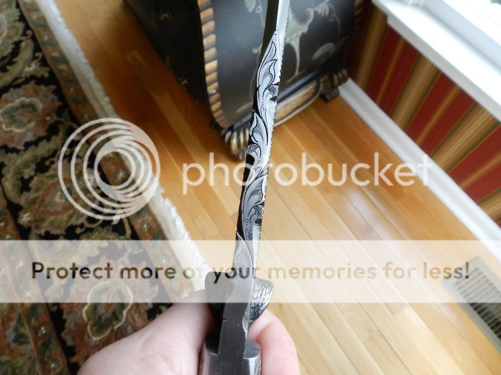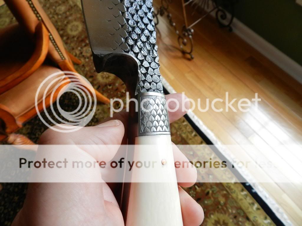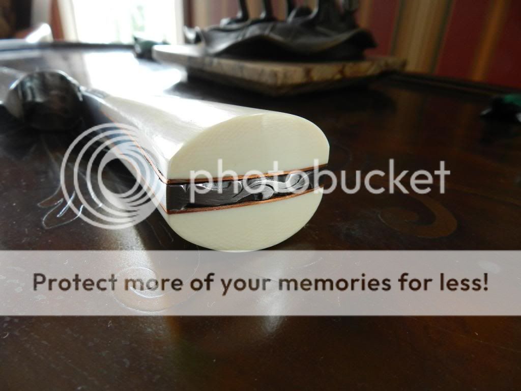 Overall 15 3/4 inches with Hanson dark Damascus 10 3/4 inch sharp as heck double edge blade. Tapered frame handle with premium old bark elephant ivory handle (this knife will not be for sale if the laws change). The ivory is smooth polished and the lines appear blue/black in color.