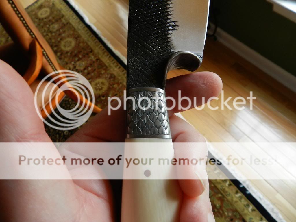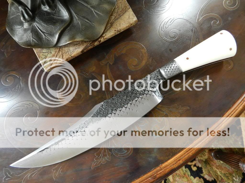 . Approximately 14 1/4 inches overall with a 10 inch blade, including the flared section where your forefinger rests, great ergonomics! I understand Joe travels to France to source the files that are the basis for his Brut de Forge blades. Engraved bolsters and carved & engraved spine that leads up to a shapely and sharp clip. Copper liners and carved & engraved at the back of the full tang. Signature Joe Kessler sheath with wonderful features and details as shown in pics. Serious character and signature design from one of the great makers and a true gentleman.