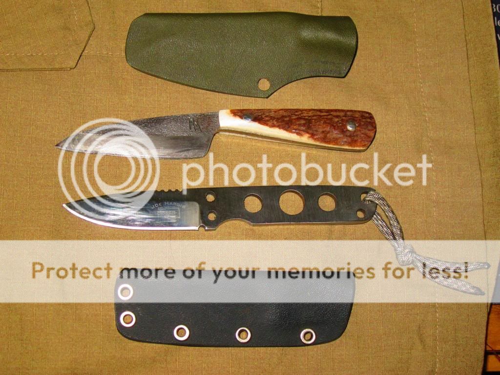 Joe Hargis skeletonized neck/pocket knife: It is flat ground 5/32 stock 1095. Has an unsharpened swedge, thumb jimping and kydex pocket/necker sheath. Overall - 6 1/4", Edge - 2 5/8", Blade Height 3/4" Has kydex scuff marks but is new as received from maker. It is the knife on the left. Looks exactly the same as knife on the right. The lighting just makes it look darker. $50 shipped. Sold Pending Funds