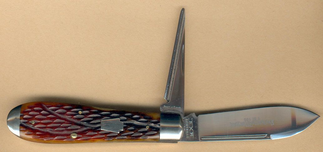 This HJ comes from Gene Shadley, a respected Minnesota maker. He really put in the extra effort here, machining the punch from a solid block of ATS-34, and putting it in a pleasing sleeveboard pattern he just designed, with old Utica bone handles. For the ogling pleasure of those who appreciate this rare pattern with me, here she be (in my usual boring scanning style. I gotta learn how to provide a setting like some of you pros):