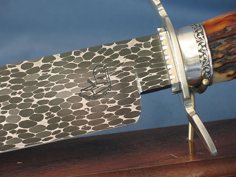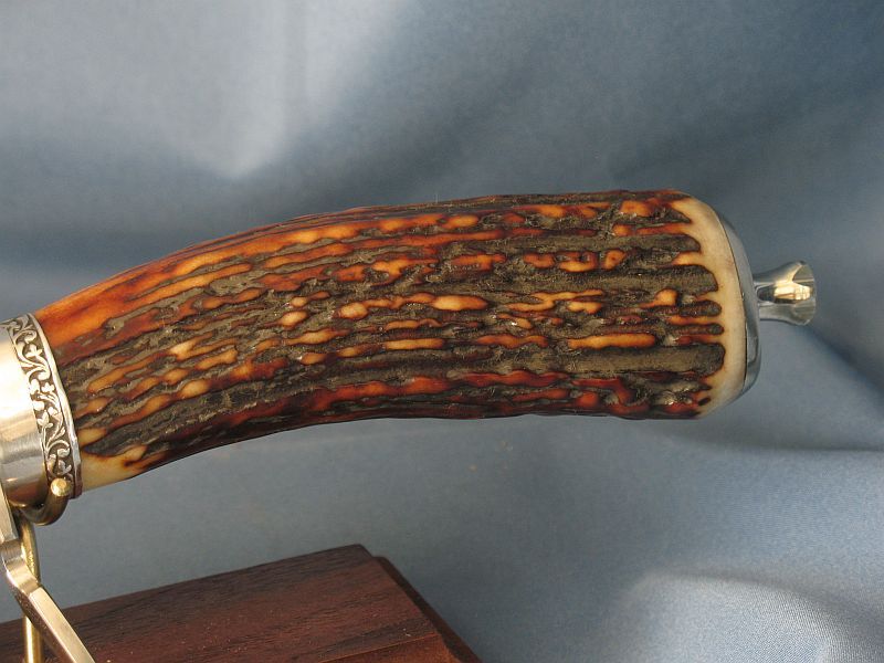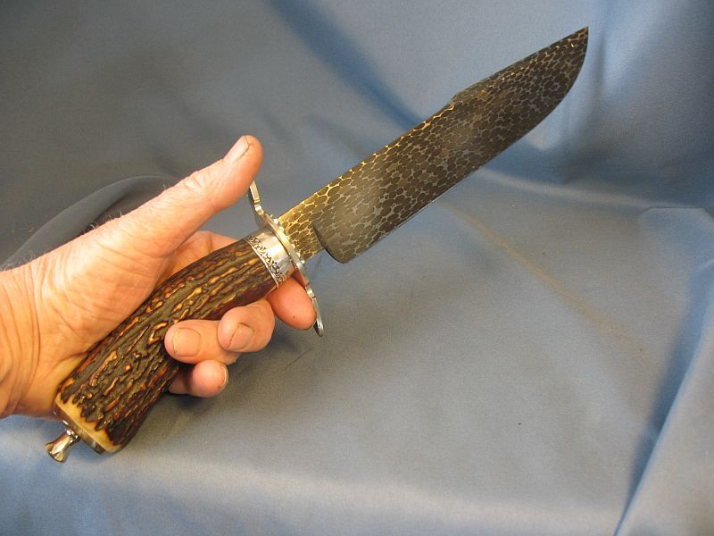 Nice Bowie or fighter with a nice cut of stag. Balanced right in front of the guard. It has a 9 1/4 inch blade and is 14 3/4 inches over all. Nice Sambar stag that is good for either left or right. Stand comes with it. I would like "SOLD" for knife and stand with 8.00 mail in USA. My e-mail and paypal address is dangraves4923@earthlink.net