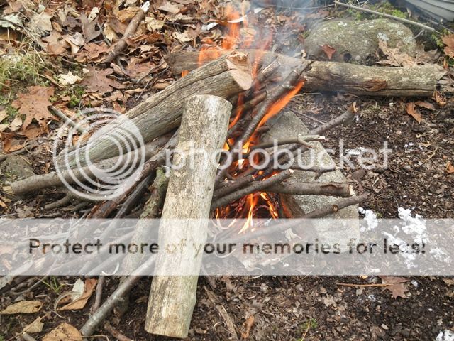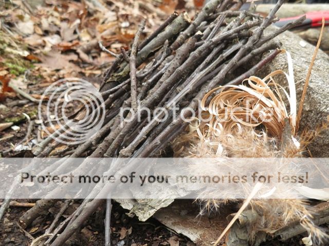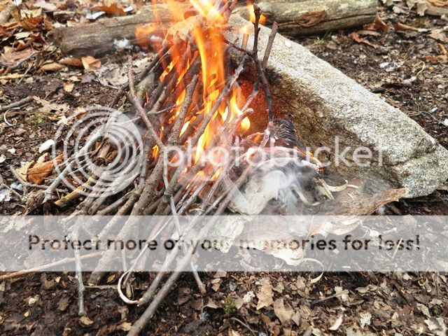 My favorite quick fire is the lean-to fire. Using a rock or large diameter log, make a platform in damp areas like here, and lay down the tinder. We used pompas grass for tinder and a few small fuzz trees, then added the smaller tooth pick/pencil/finger thick pieces all at the same time. The beauty of this fire-lay is the air passage (in the direction of the wind) that allows for igniting and then walking away, letting the air do the work while we tend to the more important stufffood!