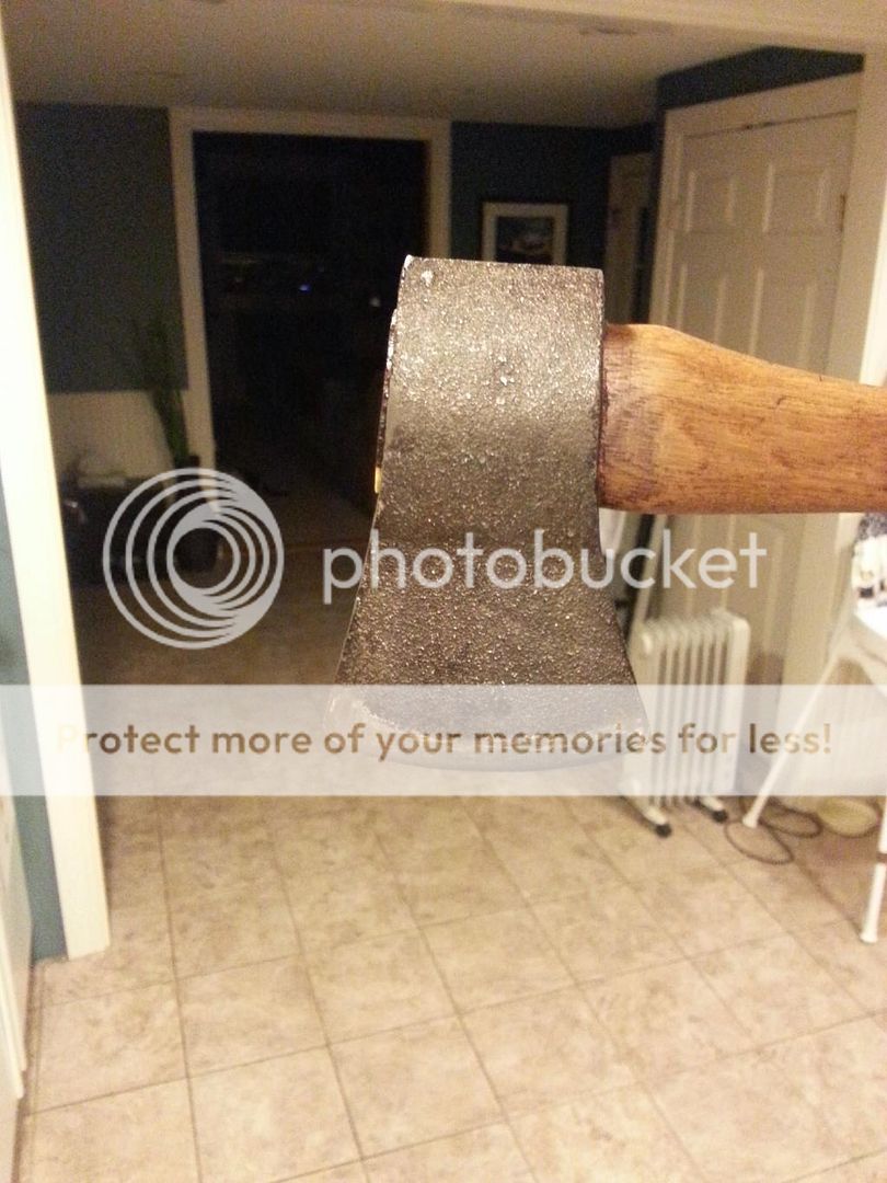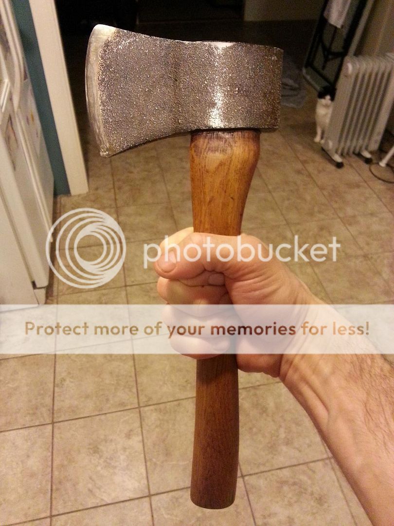 This is a recent purchase, an antique store find that included a green canvas sheath. The handle was so dry and head so loose that I was able to slip it off by hand and remove the old wedge with my fingers. I re-wedged and oiled and it looks awesome. I'm wondering if anyone has seen this before and can ID it. There are no markings, but it looks European to me based on the profile. The handle is 13" long and the whole shebang weighs 22 ounces. I was thinking of keeping this one and using it to start playing with hatchet carving. The profile looks right for this. Anyway, if anyone knows what I have here i would be grateful to know.