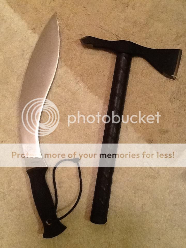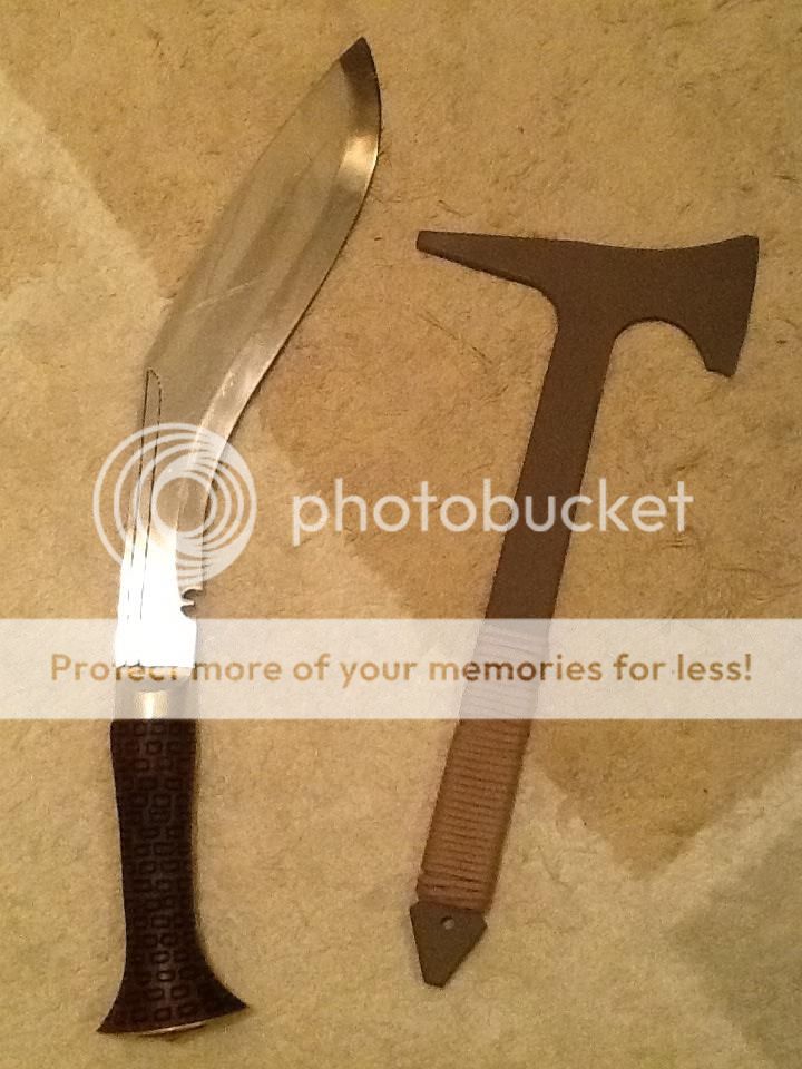 I have a mini hawk design that I am about to make from some 5/16" 1075. Specs on the mini hawk that I will call the FPL (final protective line) will be 8.5" total length, about 4 1/4" from spike to edge, and an edge of a little over 2". Spike will be around 1 1/4"- 1 1/2" long. I think it will be a good size for a hawk that can be realistically worn on gear without being so big that it gets in the way and not to small for use as a weapon or a tool.