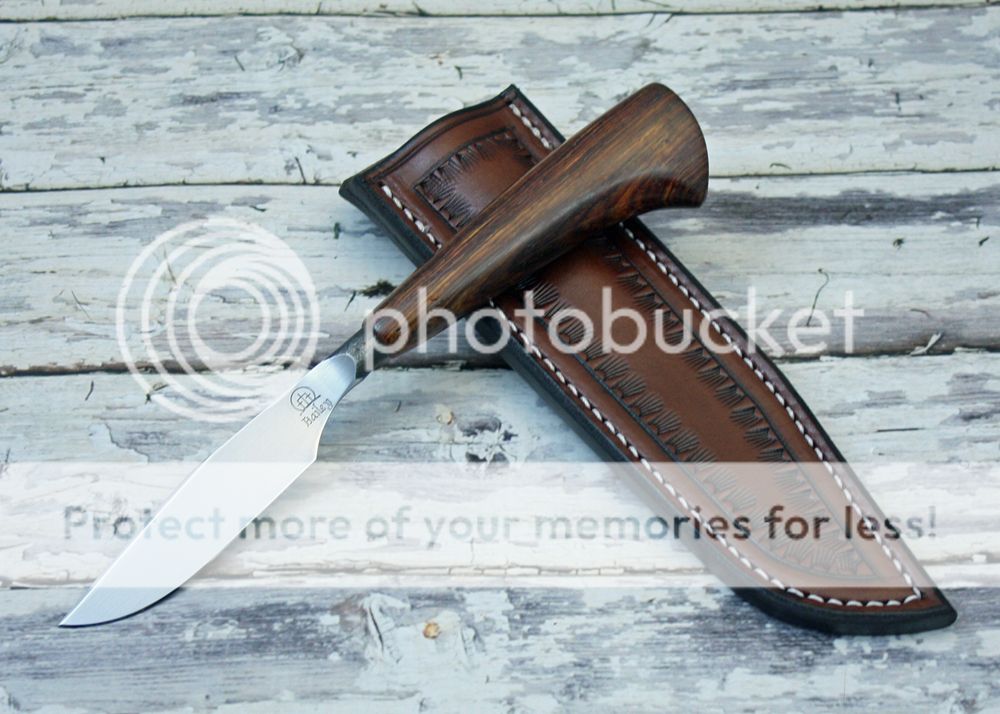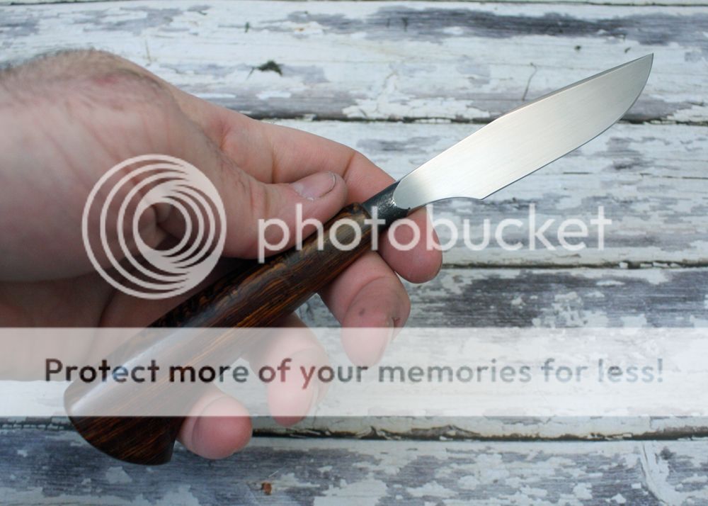 The handle is cocobolo, with a through tang construction. The tang is peened on the end and the whole thing is very solid. It fits the hand well and has been polished and smoothed to make it comfortable.