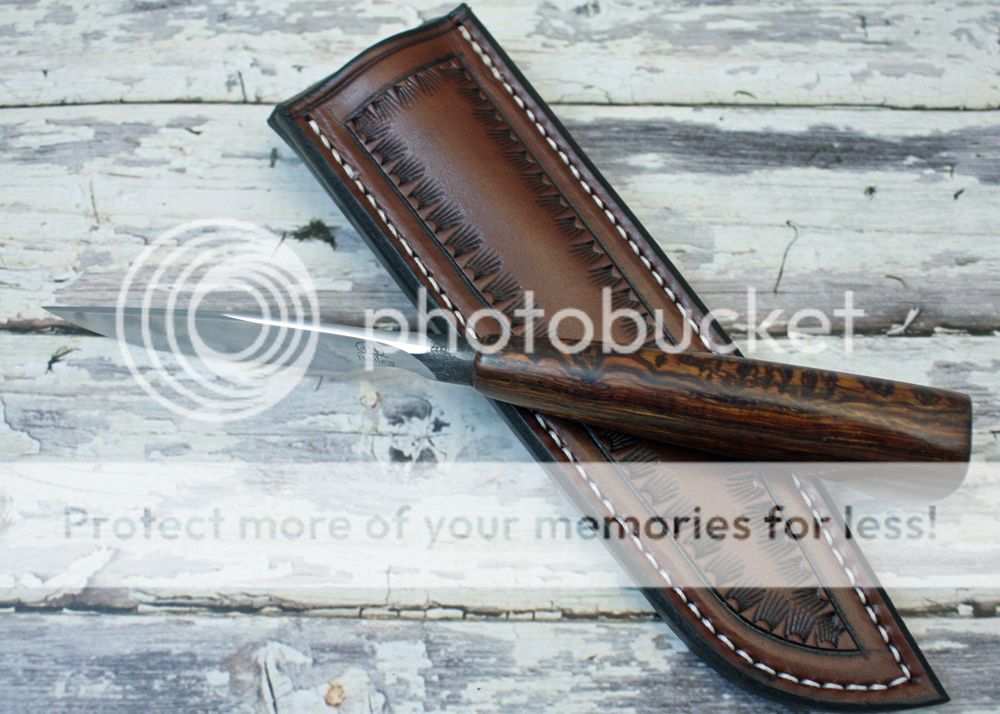 The sheath is 7-8oz hand tooled leather from Wickett and Craig. The knife fits well and draws easily.