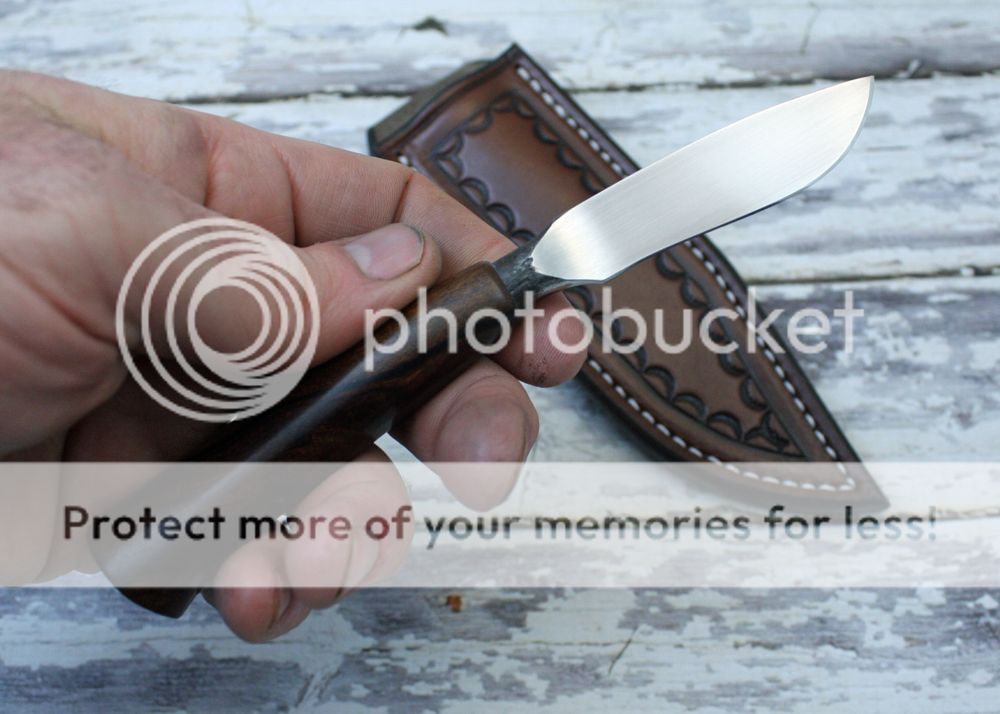 The handle is desert ironwood. The tang is a through tang and is peened on the end. Being it is small, it fits the hand well.