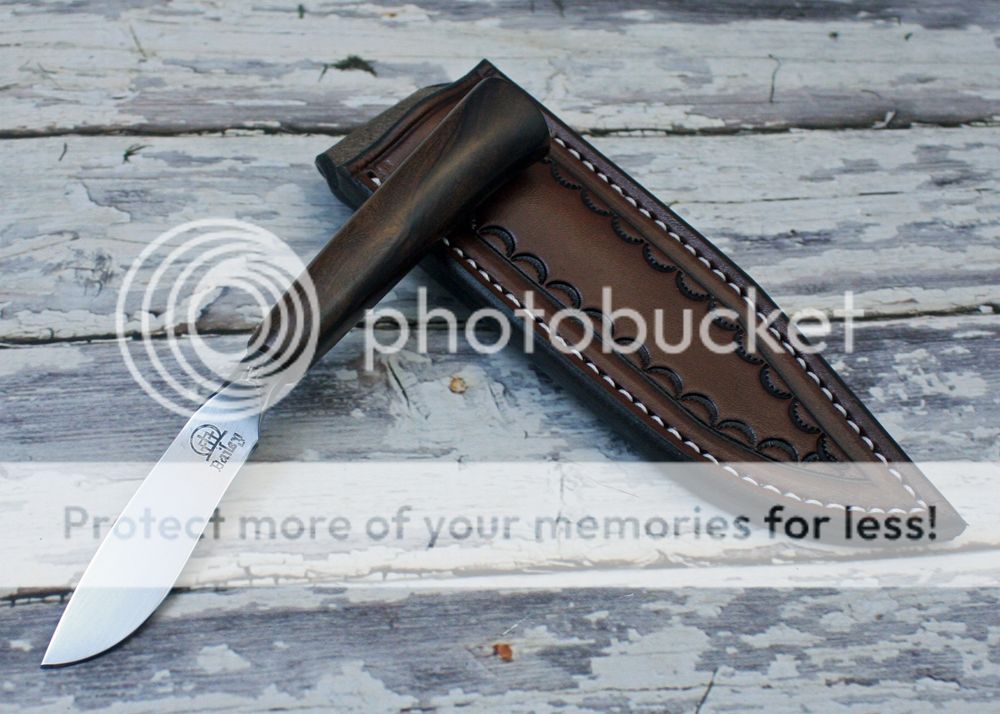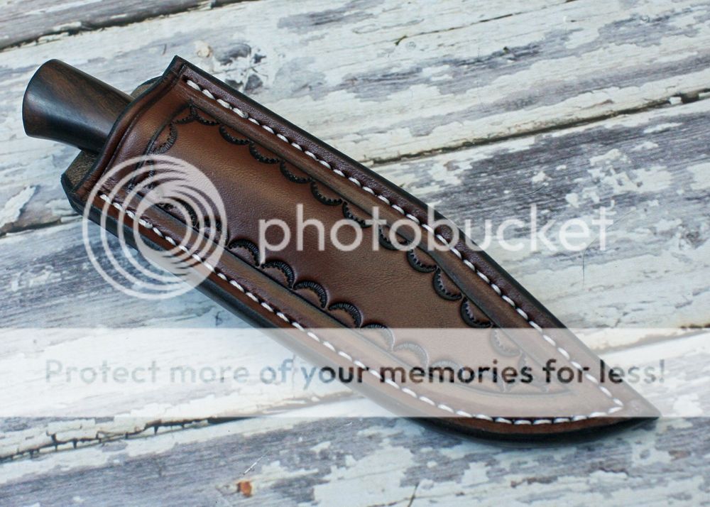 The sheath is 7-8oz hand tooled leather from Wickett and Craig. The knife fits snugly and draws easily.