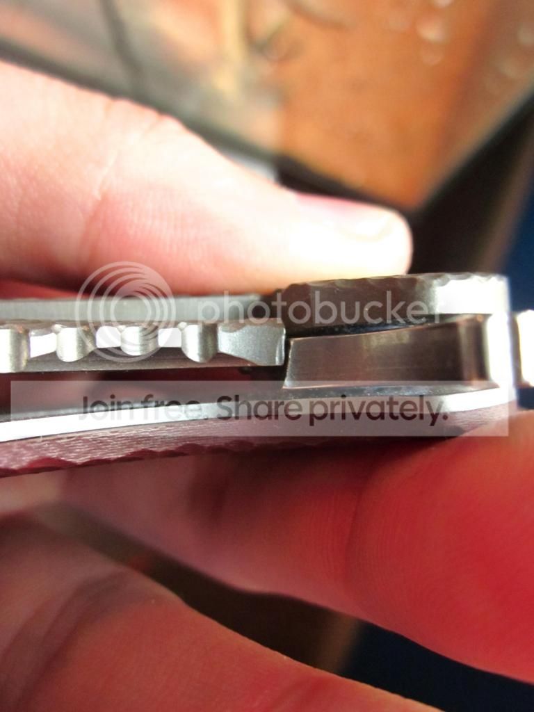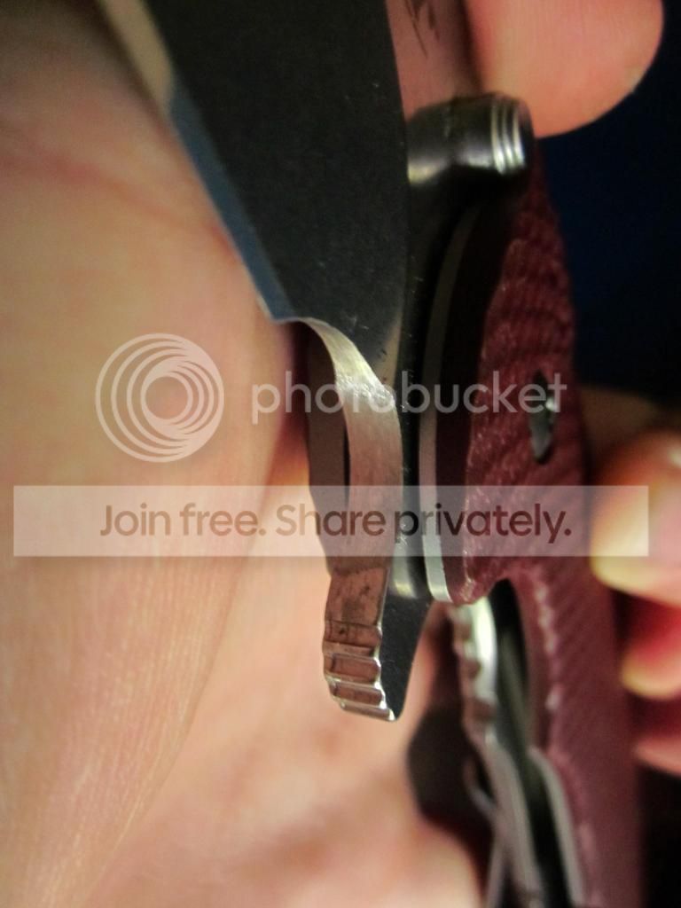 The knife deploys very smooth which is to be expected from the bearings. There's no side to side play but there is up/down play. I think if you carbidize the lockbar again it would alleviate the play but I don't have a carbidizer. There are also some light scratches on the left side of the blade right below the spine. That is the only real wear on the knife as far as I can tell.