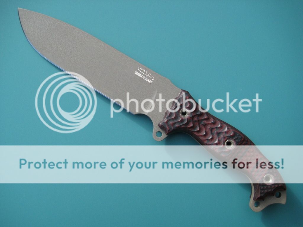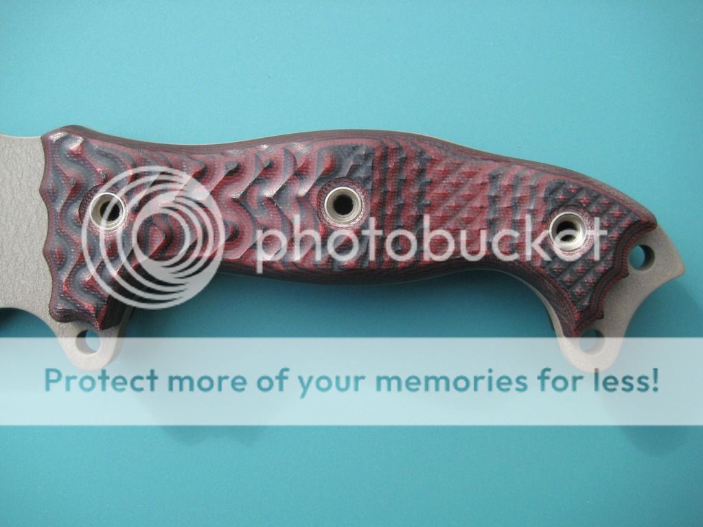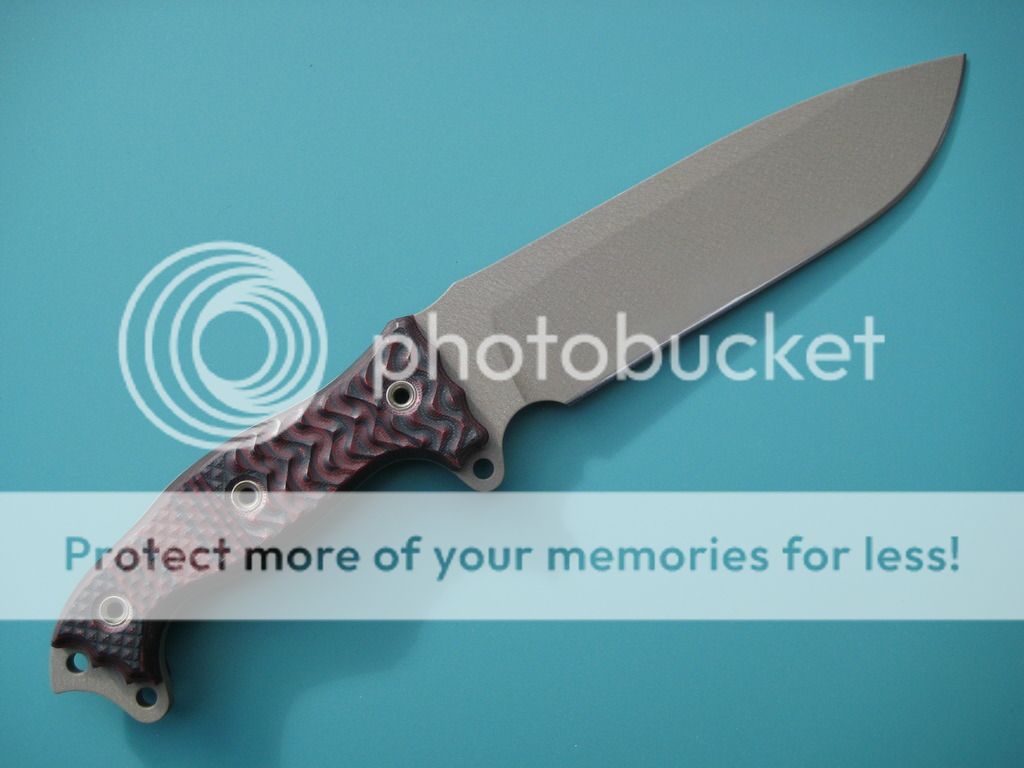 Here is a really nice, lightly used Heavy Heart with a .28 thick blade. Desert Sage coating with Red and Black G10 handles. The handles are not tapered on the front or back (see pics) like you typically see.