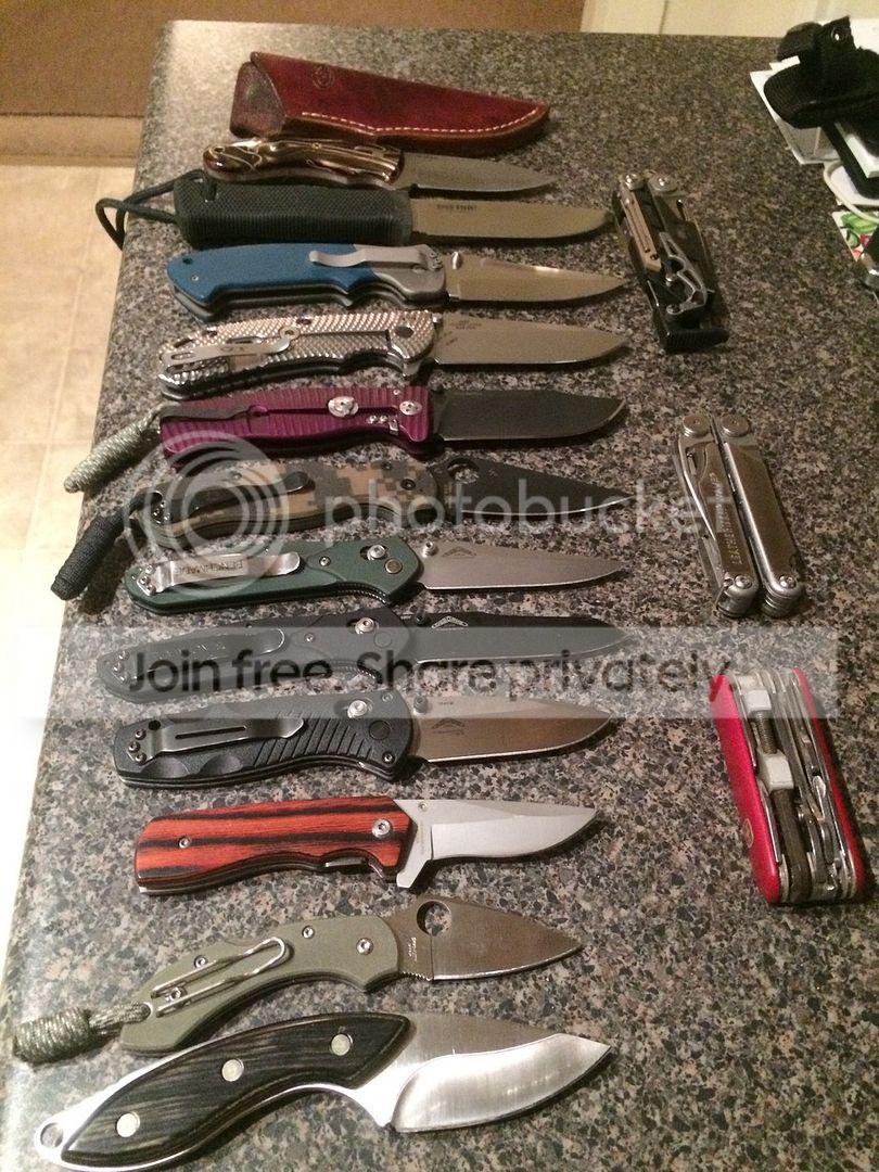 Top to bottom John Miller custom hunter in D2, Cold Steel Master Hunter VG 1, Pat Crawford Ti Kasper, ZT 0560, LionSteel SR1 TNP Edition, PM 2, Benchmade 943 and 940, Mini Grip, flea market 10$ something or other, Dragonfly G10, Buck Mini Alpha Hunter, and on the right a Leatherman MUT, Wave, and a SAK bike edition multitool that rides in my camelback when mountainbiking.