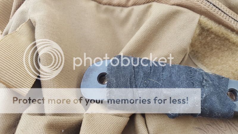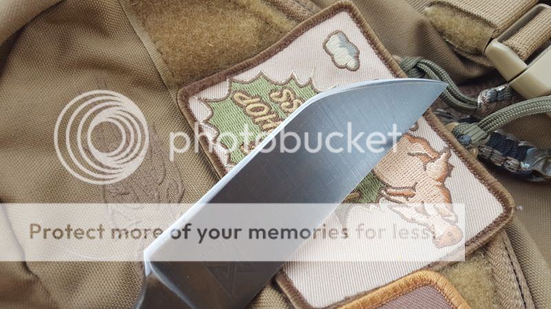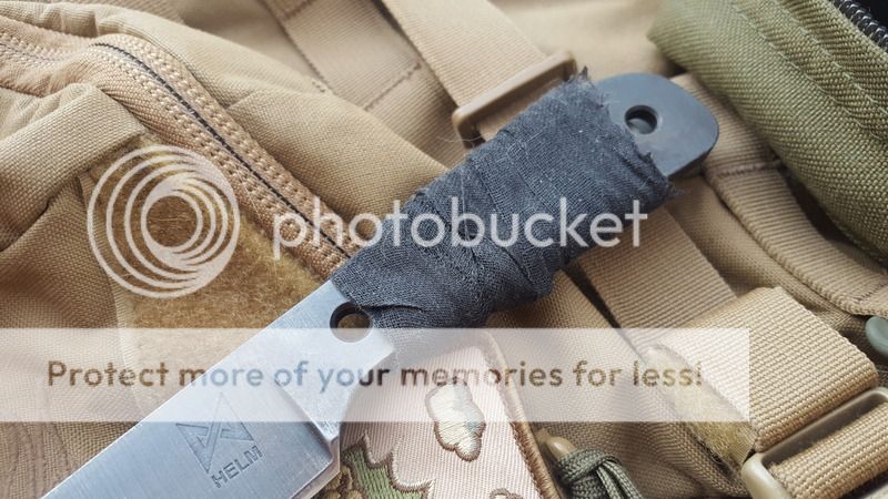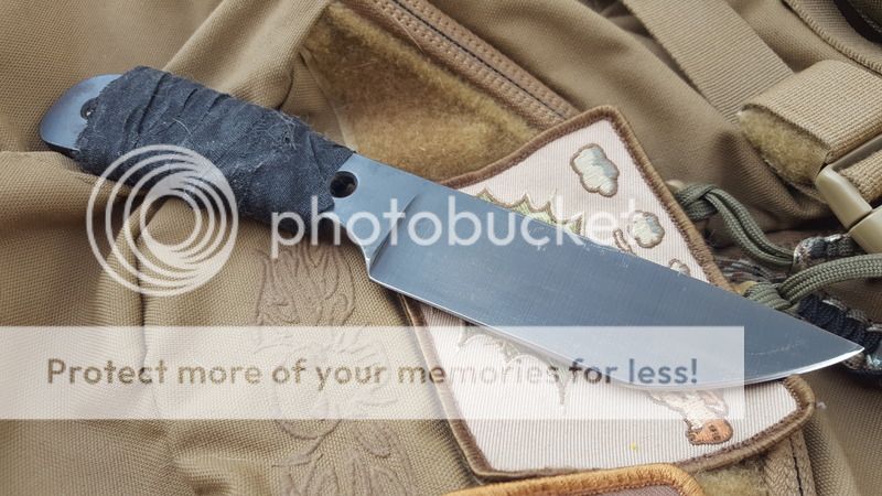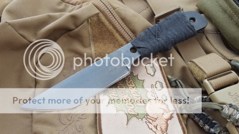 2) Helm Grind Plate Carrier Drop Point Tanto (?), grip tape handle, no sheath. 80CrV2 steel, 4 1/4" blade, 8.5" overall. Knife is unused but I have stropped it, like the Wharnny, the thing is sharp.