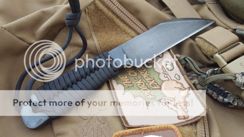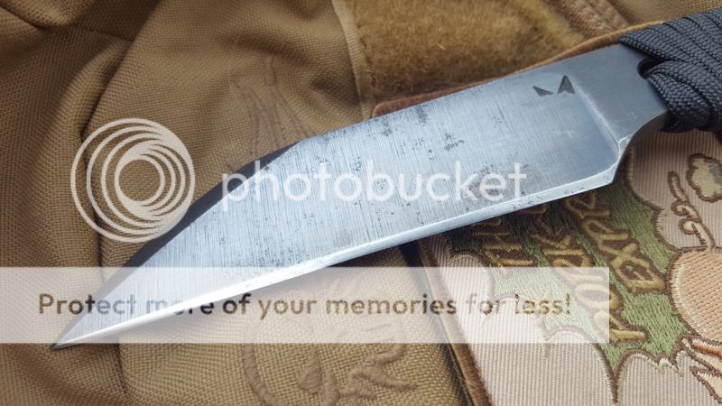 1) Helm Grind Plate Carrier Wharncliffe, paracord handle. 80CrV2 steel, 4" blade, 8.5" overall, no sheath. Knife is unused but I have stropped it, thing is a razor Regret listing it for sale already but as much as I think I'll use it, I probably won't. Mean little thing. I have humidity issues and the blued finish didn't provide a lot of protection, so there's a couple spots on the logo side.