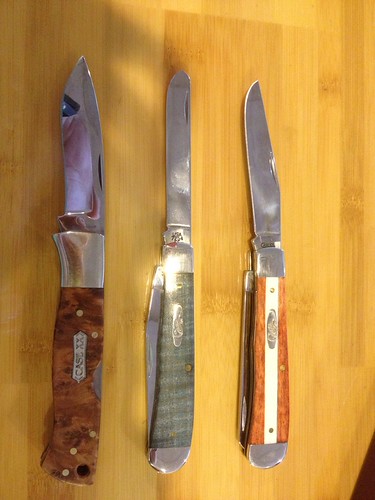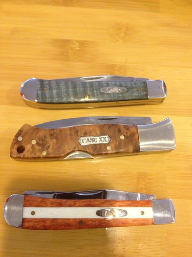 Went by the local army surplus store and saw these beauties. I took a gamble and negotiated for $120 for all three, I think I paid a fair price for them. I don't know anything about Case knives. These 3 are actually my first purchase. The lockback is made in Germany if it helps any. I would really love to know the materials on the handle of the two tone trapper. The boxes where the trappers came in, weren't original boxes. Any info on these would help, I would like to know more details about the handle material, blade steel, collectible/worth, etc.