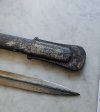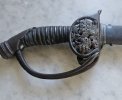 The knuckle guard folds in for wearing the sword. It has a leather finger loop inside the handle. The monogram on the pommel looks like an P (or R) and K ... maybe another letter?