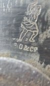 Emblems on the hilt are a crown, and a heraldry shield with three lions passant and three antlers. The maker is Pack and Ohliger, (PO&Co) Solingen, Germany.