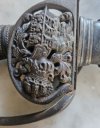 The knuckle guard folds in for wearing the sword. It has a leather finger loop inside the handle. The monogram on the pommel looks like an P (or R) and K ... maybe another letter?
