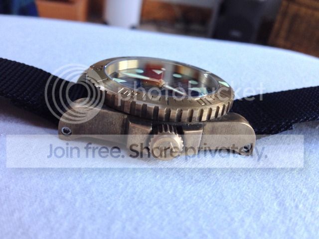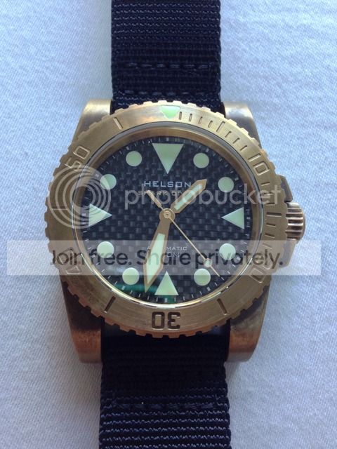 Today I am listing up my very lightly worn Helson Shark Diver. This is the brass cased 42mm version with the Carbon Fiber Dial. I am the original owner of this watch and have kept it in pristine condition during it's time with me. Currently, I have it installed on a black 3 ring zulu band but I will also include the original rubber bracelet that the watch came on when I bought it. For those of you unfamiliar with this watch, the specs are as follows: