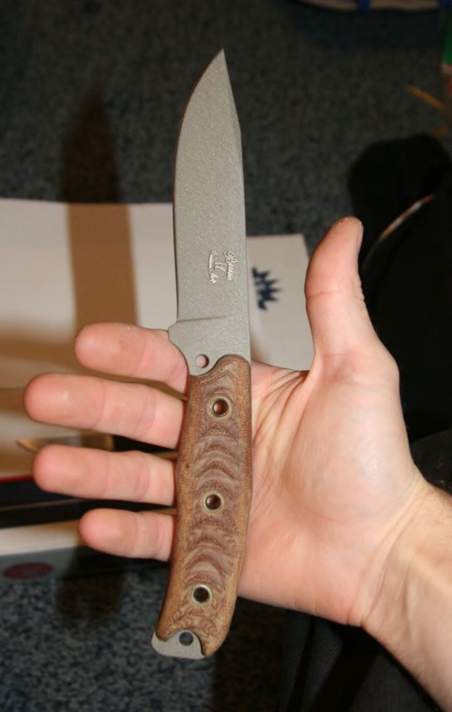 Here is where the edge to spine grooves offer little other than an unusual appearance. Again, stick the hypothetical blade into a trunk, stump or vise and pull. Perhaps Jerry has alternated the grooves on each side so that the trough of one side coincides with the crest on the other, keeping the blade thickness roughly constant. Coupled with the saber spine, the wavy blade would make the stresses that result from prying interesting. I can visualize the blade failing at the "grind line". I suspect, however, that Jerry has kept the grind mirror image or bilaterally symmetrical so that the peaks and valleys coincide with each other. This makes the blade thick where the peaks match and thin where the valleys do the same. When prying, the blade is most likely to fail at the thinnest part free of restraint. With enough prying force, the blade will fail at the valley of the first groove not stuck in the trunk, stump or vise. Again, perhaps its just me, but I don't see the purpose of making a hard use blade with designed and built-in failure points, those being the trough of each groove.
