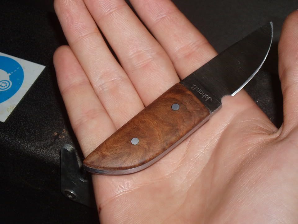 1075 steel, scottish beech burl, alu. pins.
