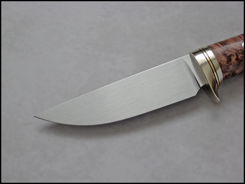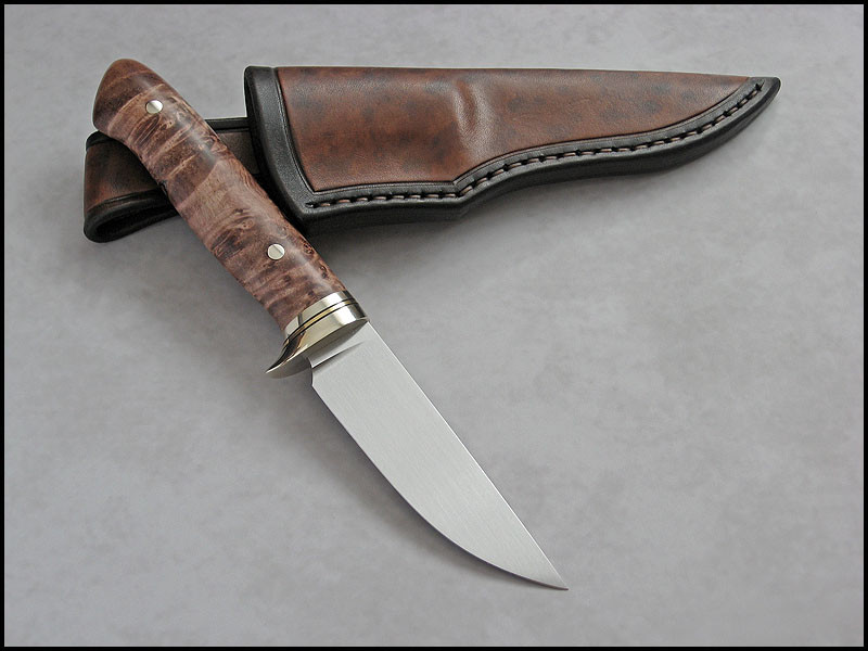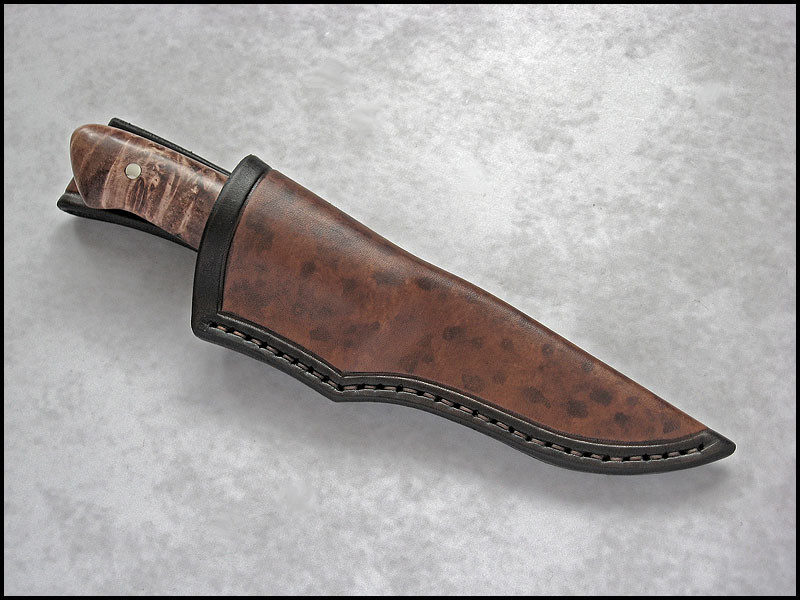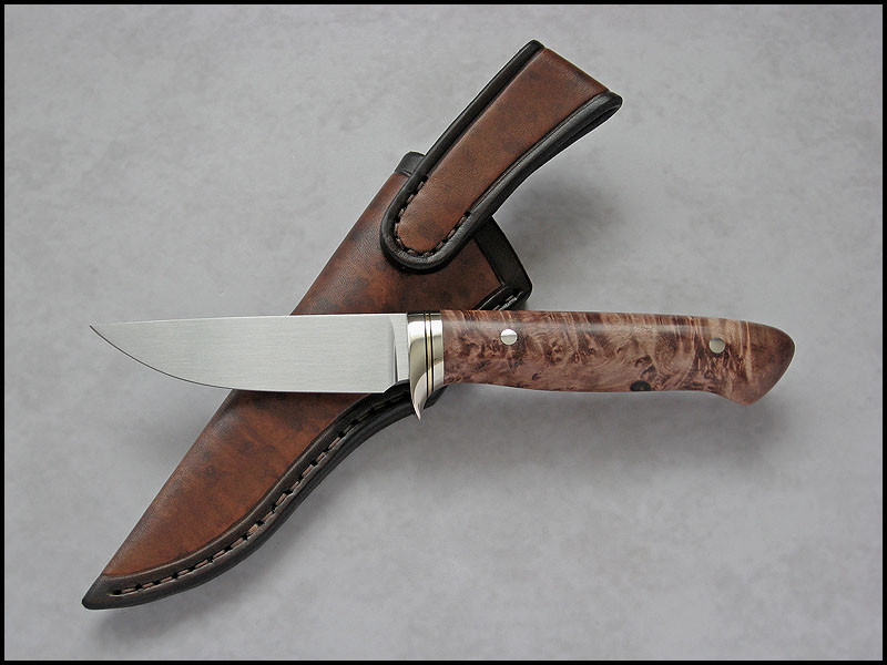 Hello This is new knife for sale. steel D2 / 3.2 mm [0.126"] length 211 mm [8.307"] blade 94 mm [3.701"] handle nickel silver, brass, fiber, dyed and stabilized Maple burl sheath leather Price - 300 US Dollars SOLD Included International Priority Mail