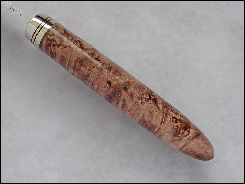 Bona The Art of Harmony Feedback: +31 / =0 / -0 Joined Apr 27, 2006 Messages 1,158 Jan 8, 2016 #1 Hello This is new knife for sale. steel D2 / 3.2 mm [0.126"] length 211 mm [8.307"] blade 94 mm [3.701"] handle nickel silver, brass, fiber, dyed and stabilized Maple burl sheath leather Price - 300 US Dollars SOLD Included International Priority Mail Last edited: Jan 11, 2016