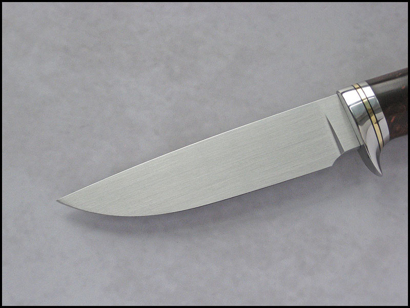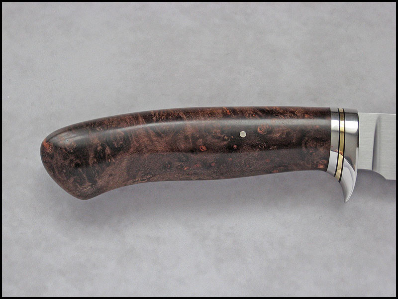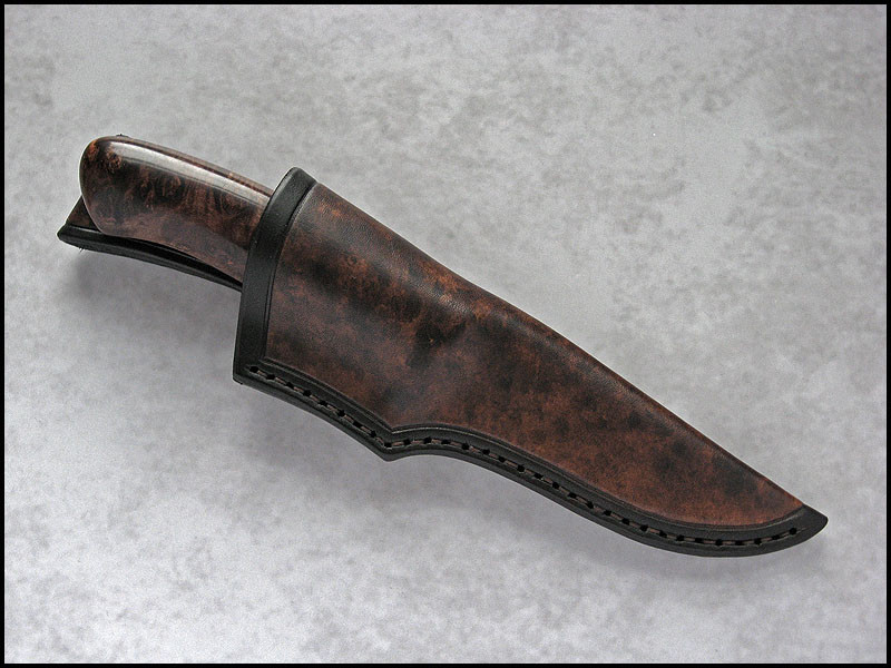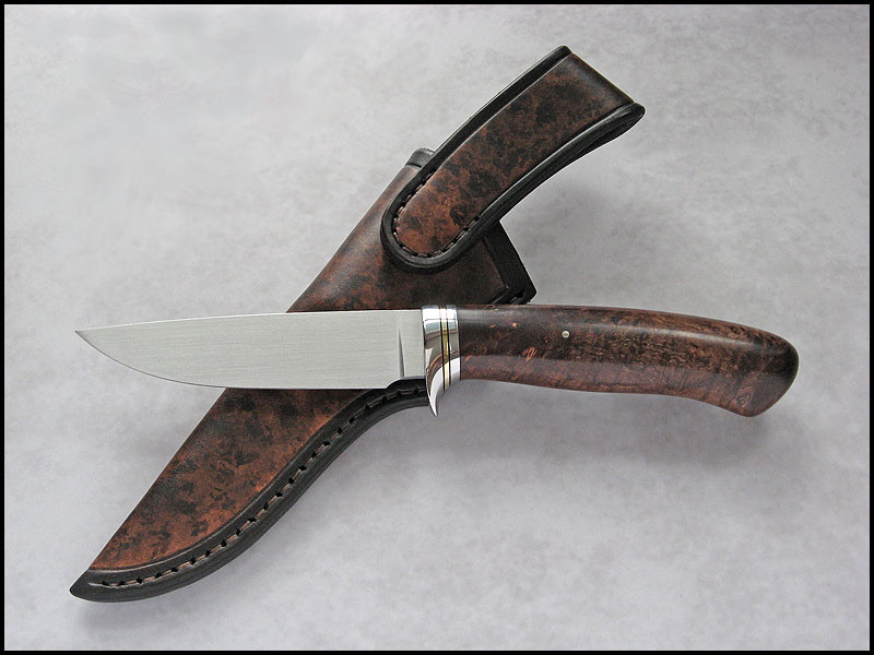 Hi, everybody My new Hidden Hunter for sale. steel D2 / 3,4 mm [0.134"] length 242 mm [9.527"] blade 116 mm [4.567"] handle stainless steel, brass, black fiber, dyed and stabilized Maple burl sheath leather Price - 333 USD SOLD Price included International Priority Mail