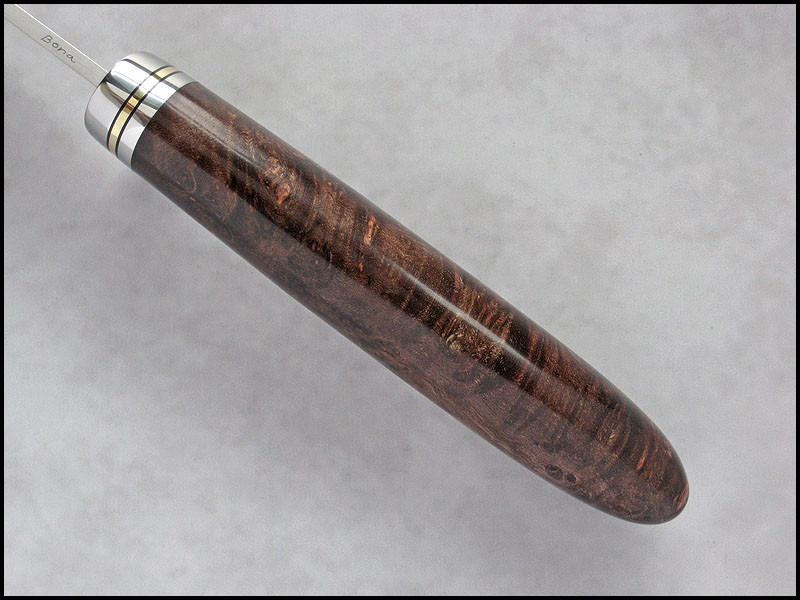 Bona The Art of Harmony Feedback: +31 / =0 / -0 Joined Apr 27, 2006 Messages 1,158 Mar 3, 2016 #1 Hi, everybody My new Hidden Hunter for sale. steel D2 / 3,4 mm [0.134"] length 242 mm [9.527"] blade 116 mm [4.567"] handle stainless steel, brass, black fiber, dyed and stabilized Maple burl sheath leather Price - 333 USD SOLD Price included International Priority Mail Last edited: Apr 26, 2016
