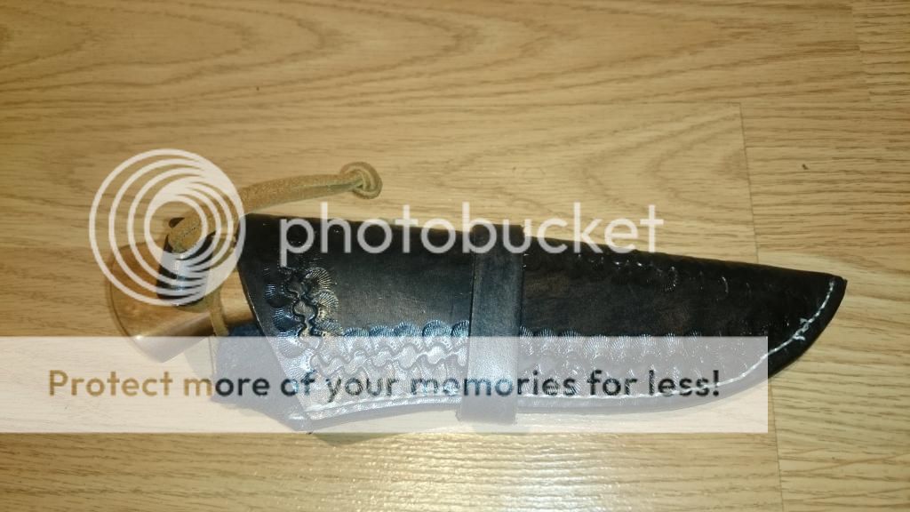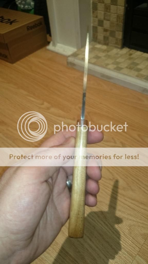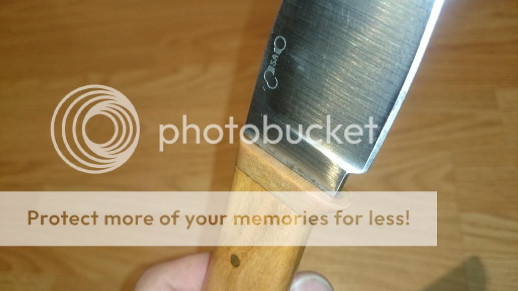 Here are the specs: Its made from Aldos 1084 steel, deep coloured cherry wood handle, with a canvas micarta guard. The handle is very ergonomic, and is super comfortable in the hand. Balance point is right behind the guard. The blade has a scotchbrite satin finish. Comes with a leather sheath.