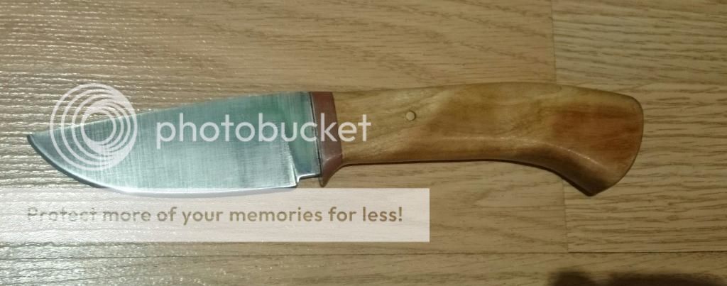 I sent this little baby out on a hunting trip with a friend of mine, to see how it performed. Well he got to use it quite a bit and was happy with it. No chips or rolls, and it skinned a Bighorn sheep, as well as an elk. It came back to me with quite a bit of patina on it. I cleaned most of the patina off, but there is a some patina visible where the ricasso meets the guard. The handle was originally finished with Danish oil, but it was not robust enough. I stripped the handle, and refinished it with Tru Oil.