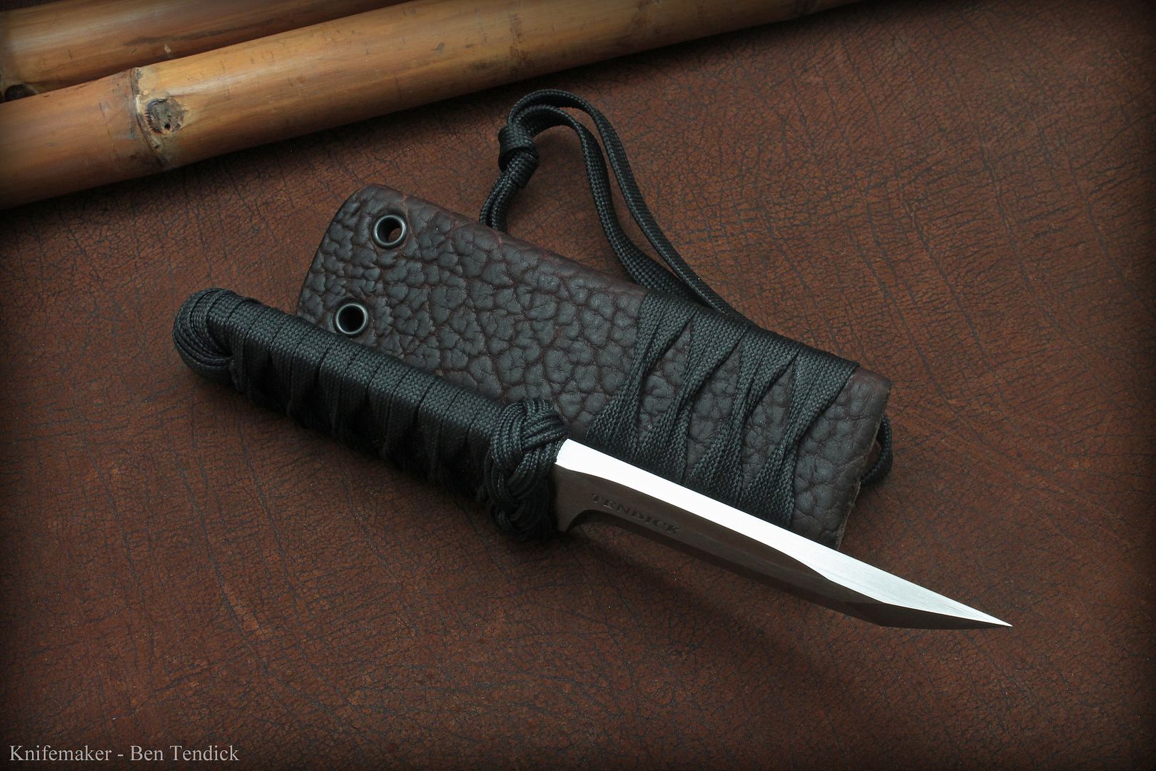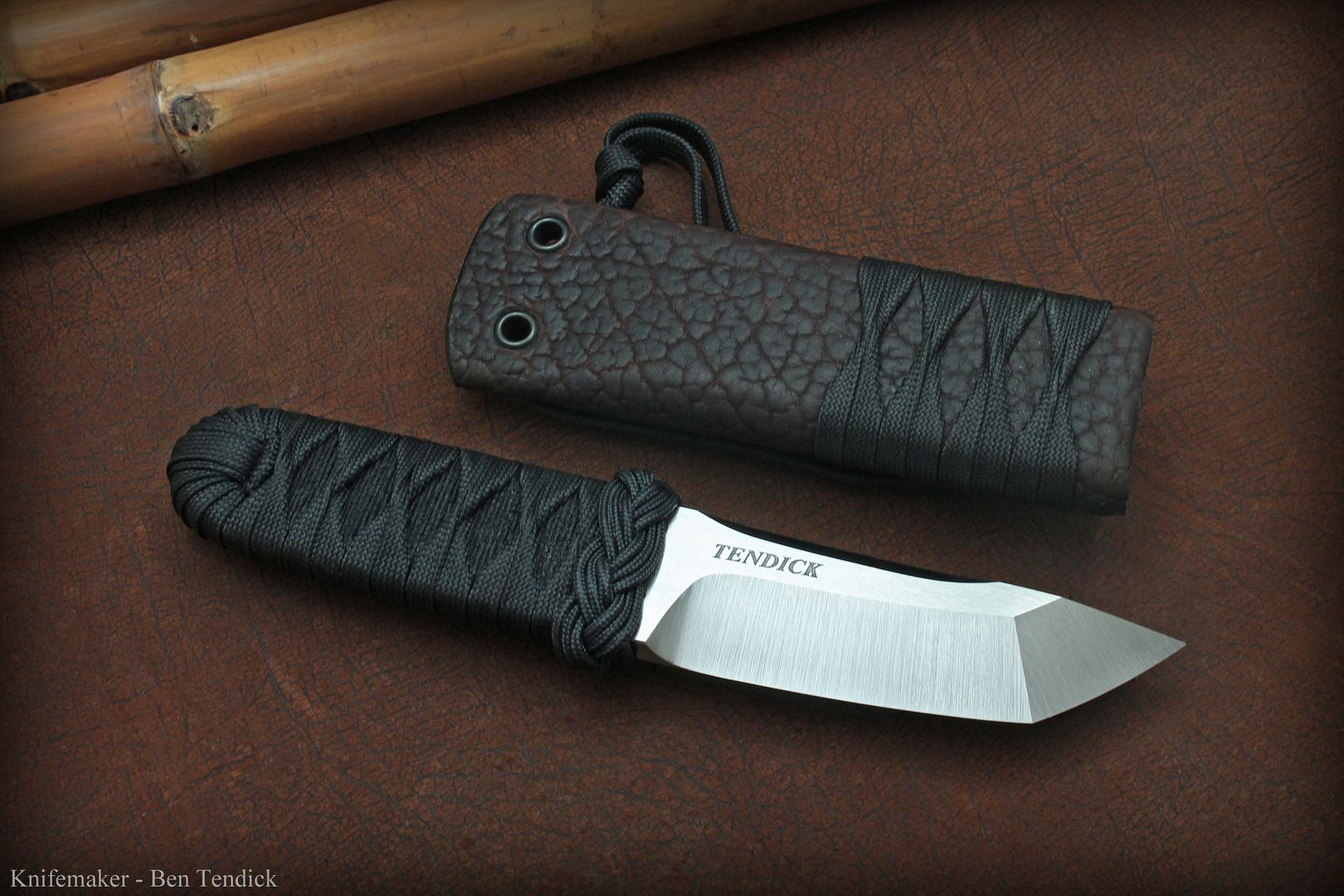 The Harstfield style sheath is Aluminum, wrapped in shark skin and lined with kevlar. The "sageo" adds grip when tucked in your belt, and also extends to act as a static cord.
