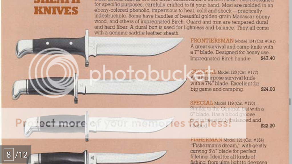 I bought my 119 (not photographed but it appears to have the same handle material as the one I did photograph) and 124 in (probably) the early 80s, but it is possible that I bought the 124 in the very late 70s, I just can't remember for sure. I suspect the 119s had the "ebony-colored phenolic" handles mentioned in the add. The 124 handle was made of something else. If it weren't for the word "golden" I might think it was made of "golden-grain Macassar ebony wood" or perhaps a composite involving ebony. It could be the "impregnated birch" if the impregnation process turned the 124 handle nearly the same color as the 119 handle.