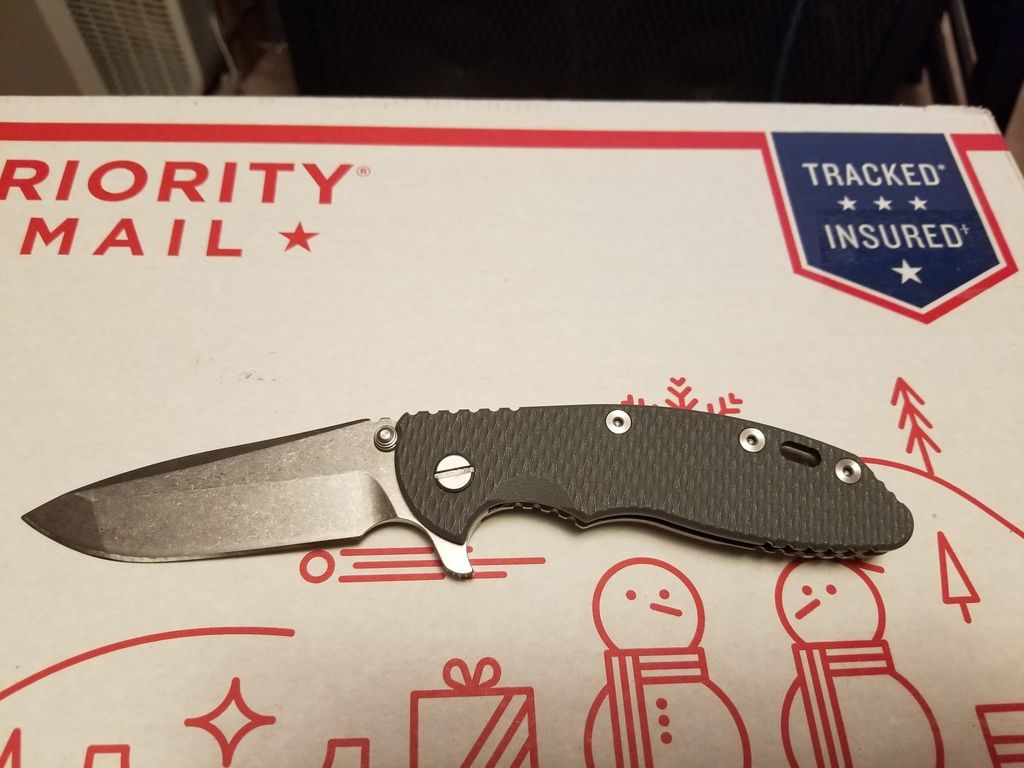 This is a lightly used Hinderer 3.5" Spanto. I believe it has been sharpened by previous owner. Knife could pass as NIB but I've carried it a few times so let's call it 99%. Scale is gray. I have the box, but no assembled by card.