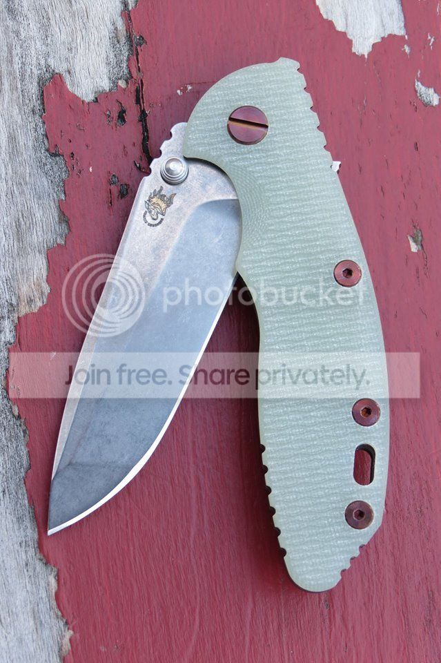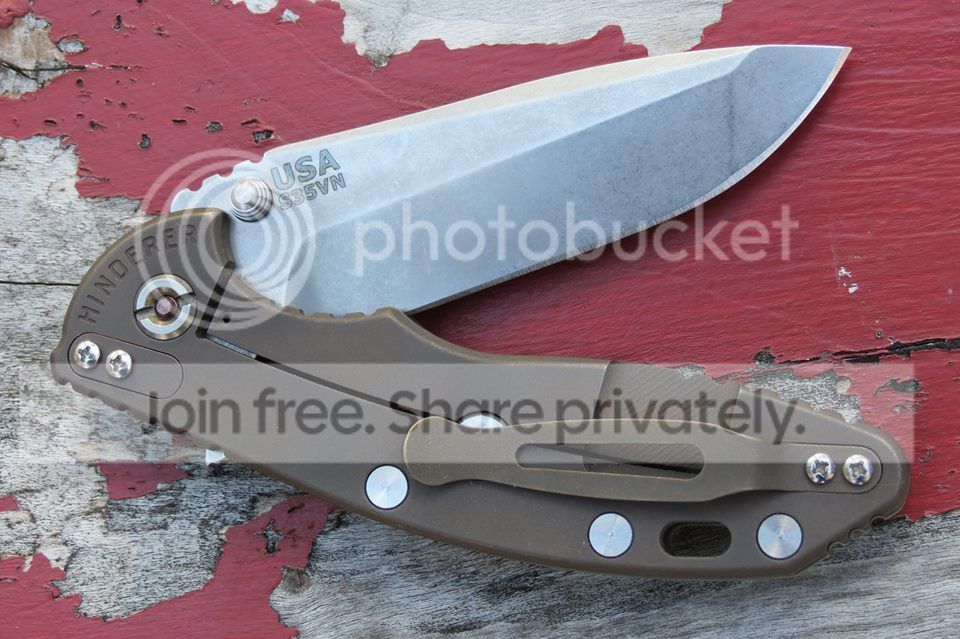 Hinderer XM-18 3.5" Spanto. Knife will come with sand scale and stock hardware installed, NOT with the trans green scale and bronze hardware. Stonewash S35VN blade. Battle bronze frame. Like new, as it came to me from the dealer. Might have pocketed it once, haven't cut anything. Factory edge. Blade is centered. Good detent, fires hard. Comes in original box/baggie with peanuts. $OLD