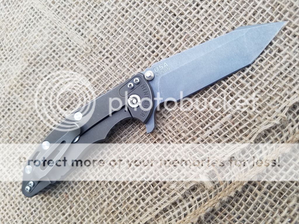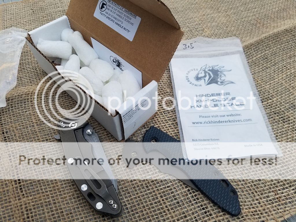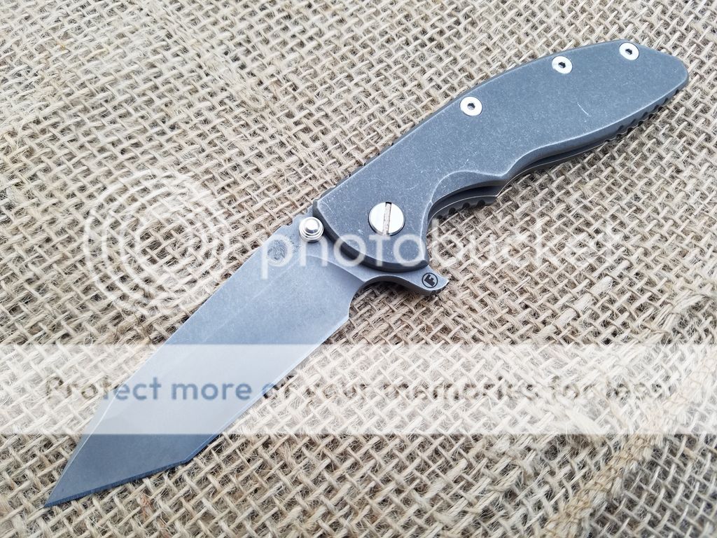 Hinderer 3.5 XM-18 Fatty Harpoon Tanto. Battle Bronze Working Finish. Ti scale is Working Finish as well. Comes with original Blue/Black G-10 scale.