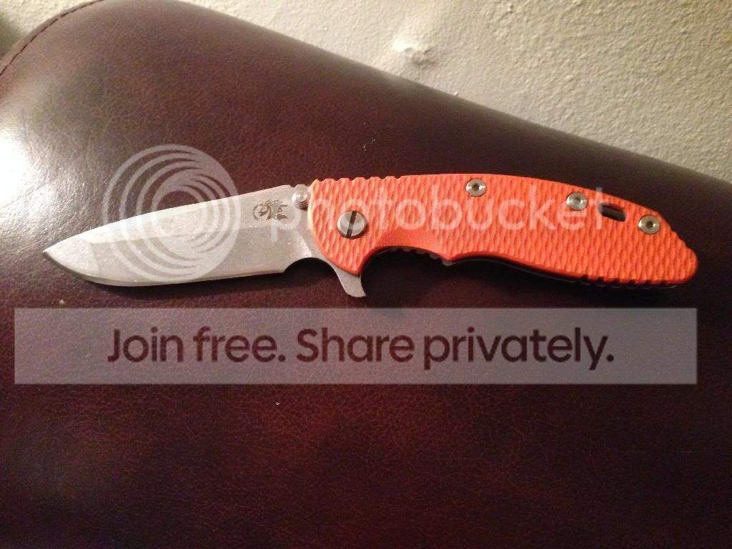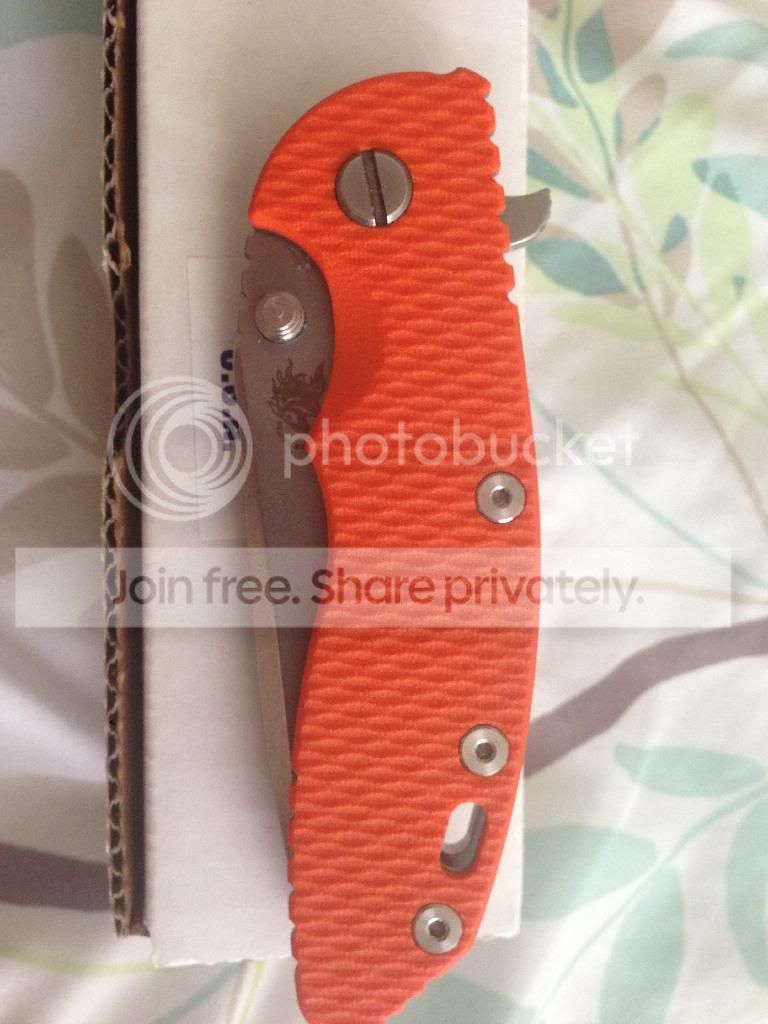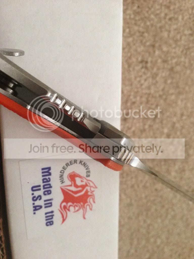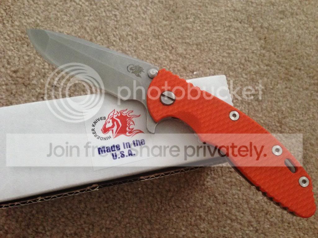 This has been my edc for the past 4-6 weeks, and I'm the second owner. Overall condition is great. It is the 3.5" spanto grind flipper in s35vn, with stone washed finish and orange scale. It has been sharpened and stropped, and will come with Hinderer box/bag/peanuts. The only negatives are a small dent/chip on the side of the tip, and a slight deformation of the pivot screw slot. The tip won't show up in pics, but it cAn be felt. Lockup is early and rock solid, blade is centered nicely. I'll let the pics do the rest