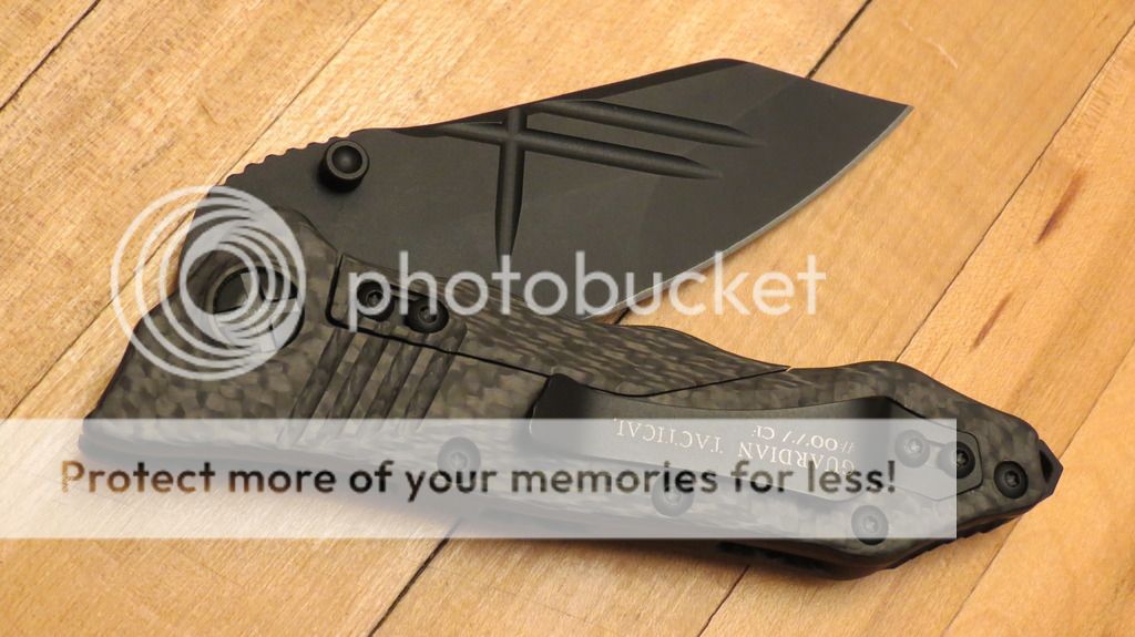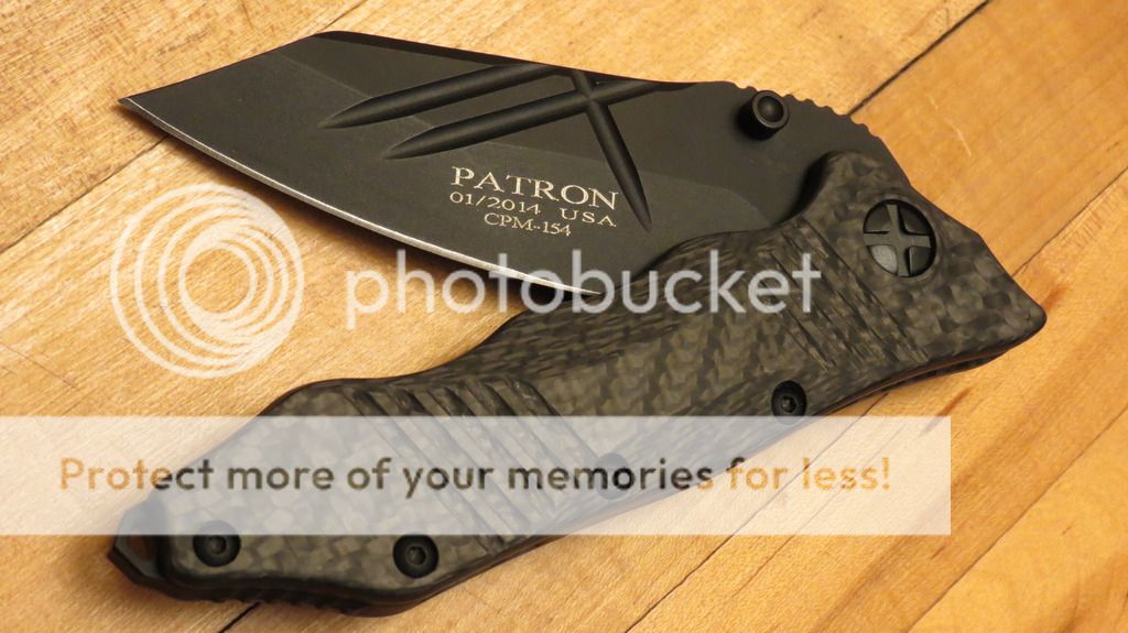 NIB Guardian Tactical Patron w/ black CPM-154 blade and carbon fiber handle. Comes in original baggie and box with warranty card. Centered, smooth, flips great with thumb studs. The name has been changed to Deltrix for this model, so those with "Patron" on the blade will only become harder and harder to find. $260