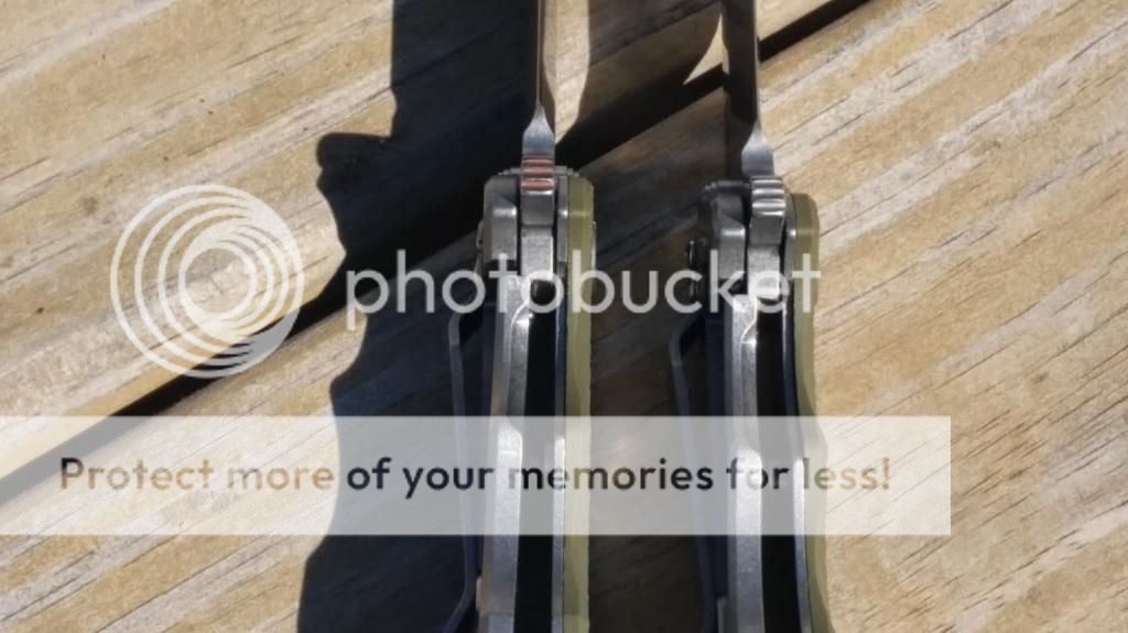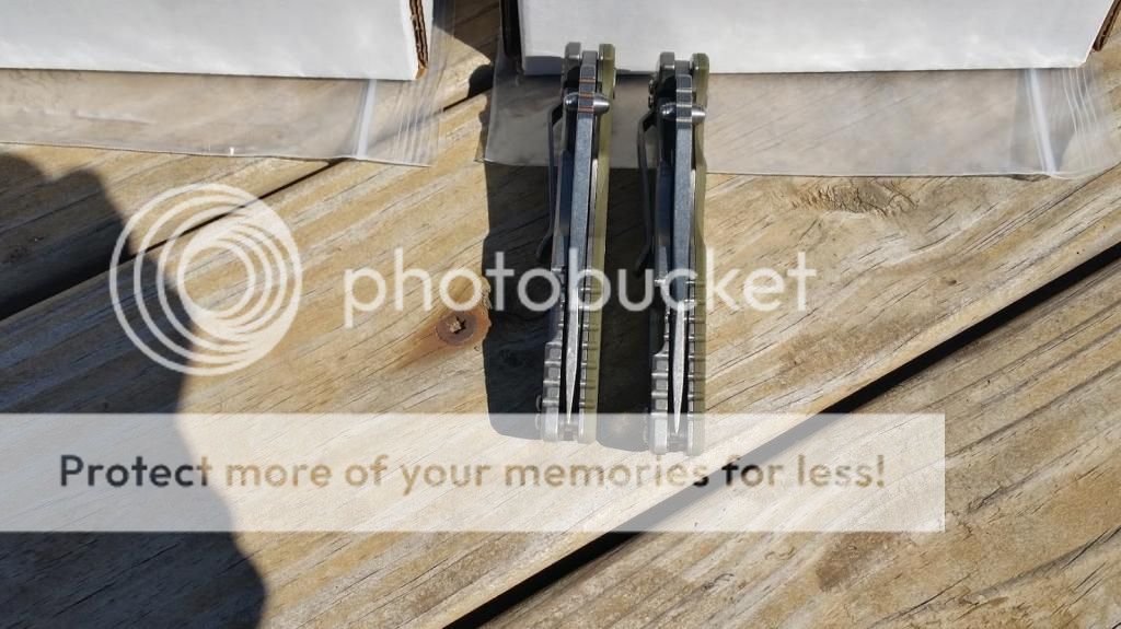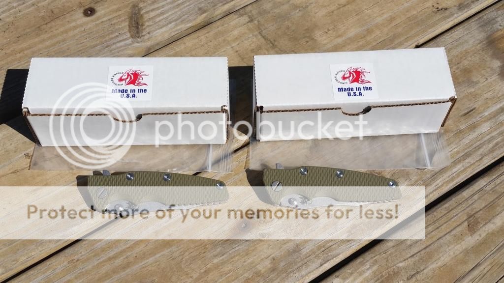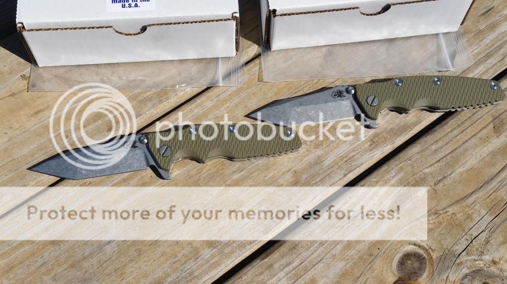 Both feature an OD Green Scale with stonewash finish on the blade and frame. You will notice the knife on the left has some additional bronzing inside some of the jimping, but otherwise, both knifes are identical. If you want a certain one, please state so in your message. Obviously first choice goes to first buyer.