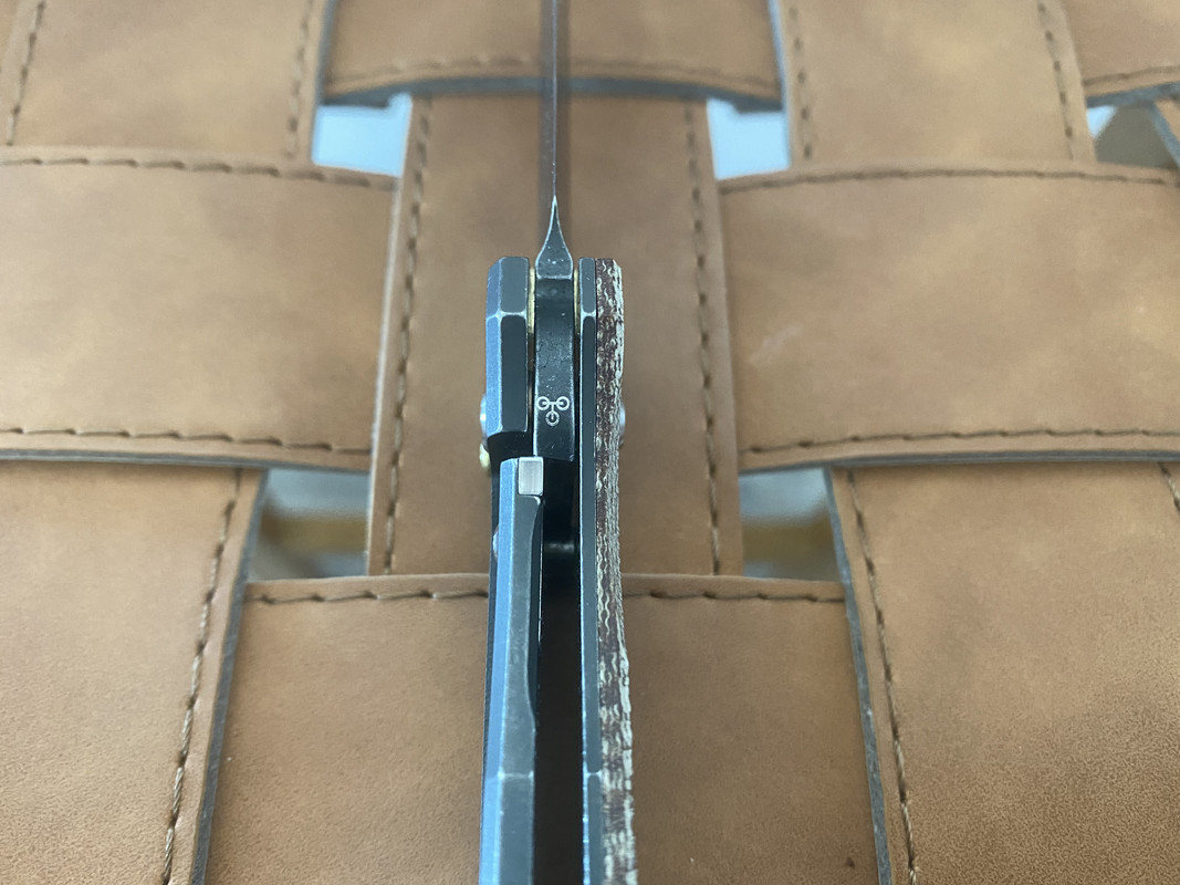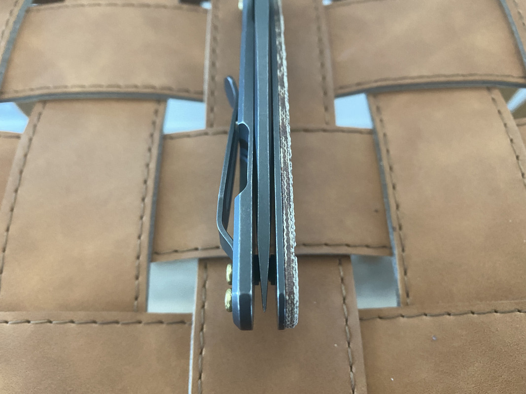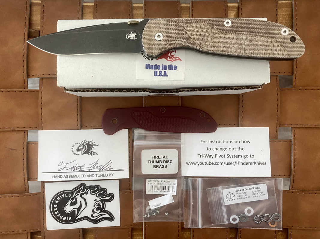 Gen 2 Firetac Tri-Way Recurve in Battle Black. Has been lightly used, carried, and sharpened. Shows little to no wear throughout. Lockup is solid at around 30%. Centering looks to be spot on. All add-ons except for clip/filler screws and Skiff bearings are genuine RHK parts. Includes brass thumb disk , brass LBS, brass clip/filler screws, original thumb disk, original LBS, original clip/filler screws, natural canvas micarta scale, original red G10 scale, Skiff bearings (currently installed), full Triway system, box, sticker, card, and tactical peanuts. Please feel free to contact me with any picture requests or questions you may have.