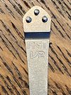 2. Hinderer Rick’s Special Projects pocket clip filler tab stonewashed with blue horseshoe and flaming horse head. May have been mounted but never carried $45