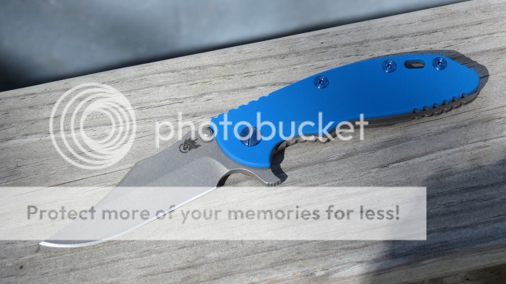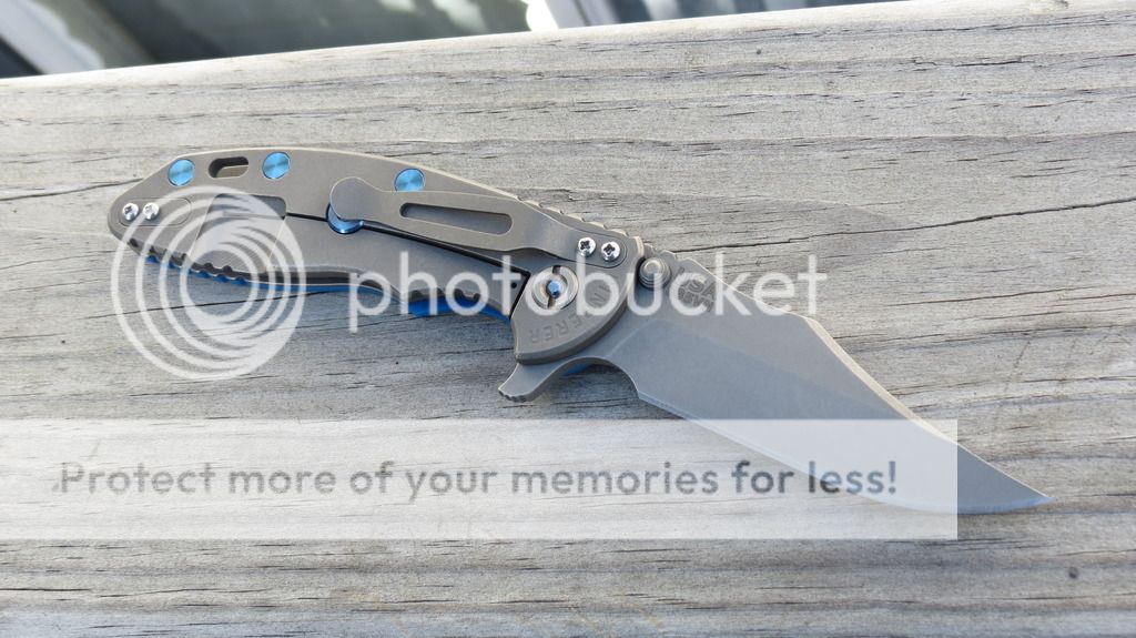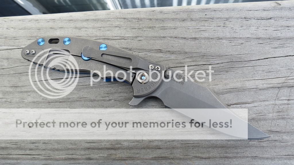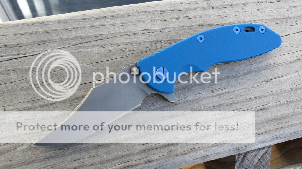 New condition XM-18 3.5" Bowie in full working finish (including studs). First owner. Never carried or used...only dressed up. At my asking price, the knife will come with stock hardware installed (not the blue ti hardware) and a textured G-10 scale installed (I have options). Centered blade. Flips well. Beautiful finish on this one. $OLD